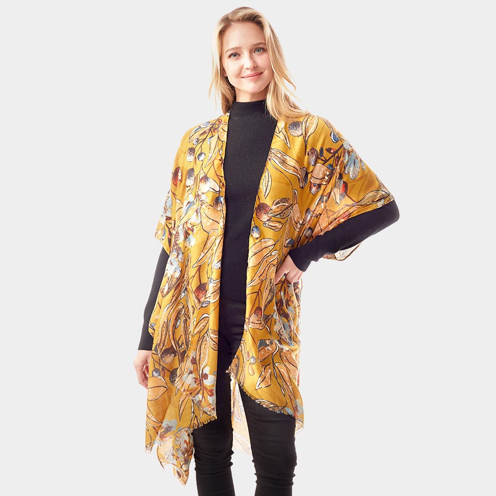 Floral Printed Gold Foil Accented Ruana Poncho