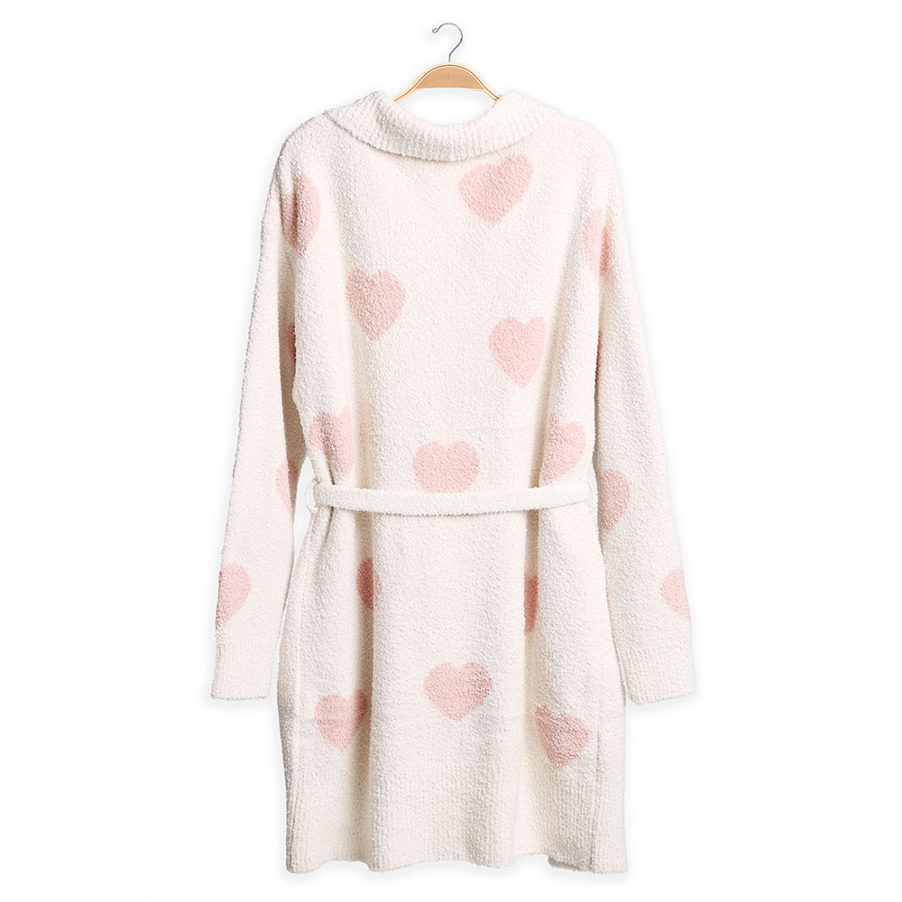 • Lounge with love in this heart-patterned knit robe, featuring a belted waist and cozy pockets. A sweet and comfy choice for relaxing at home in style.