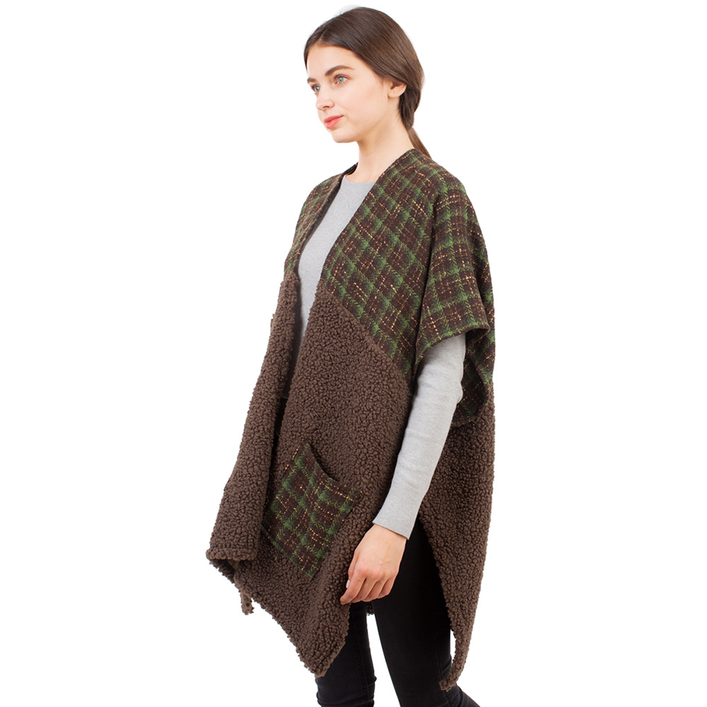 • Cozy open-front vest featuring a plaid upper panel and soft textured body. Designed with convenient front pockets and a relaxed fit, it's an ideal layering piece for casual comfort and seasonal warmth.