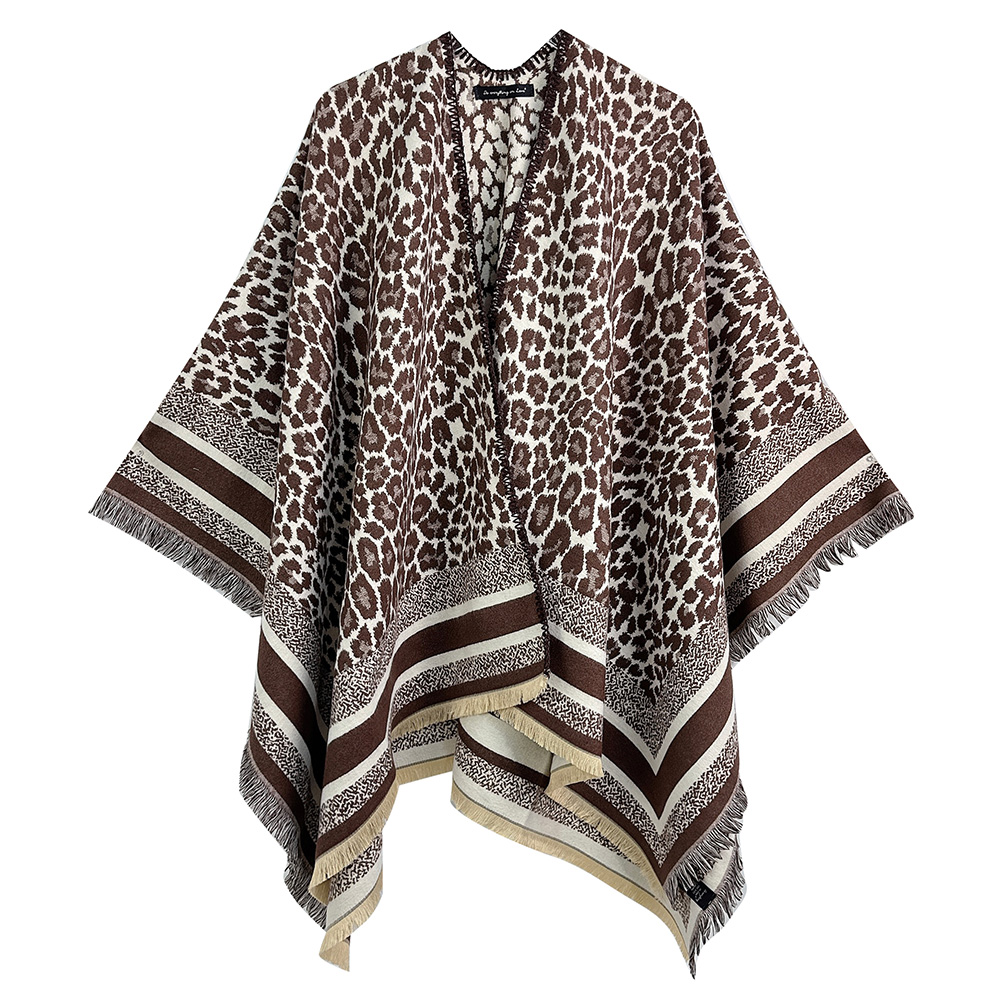 • Stay warm and stylish with this poncho featuring a soft leopard-inspired pattern and elegant fringed edges. Perfect for layering over any outfit, it offers a blend of comfort, versatility, and sophistication for both casual days and chic evenings.