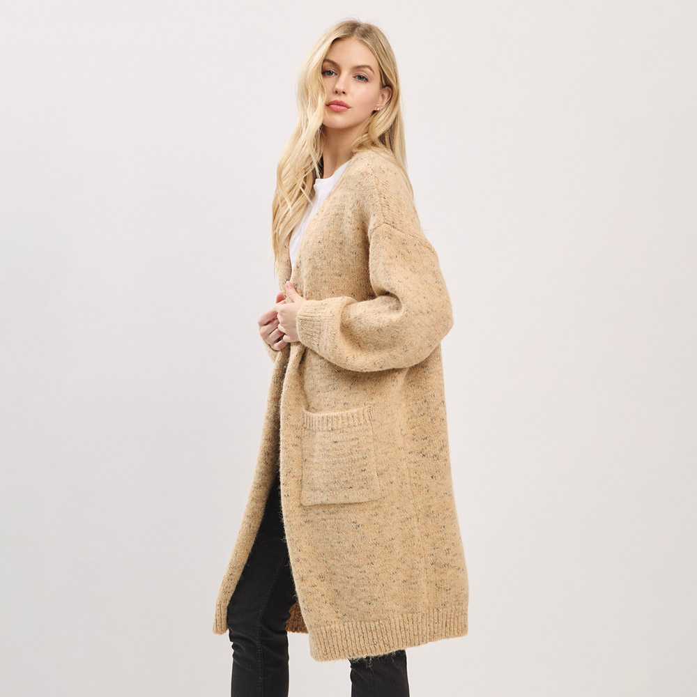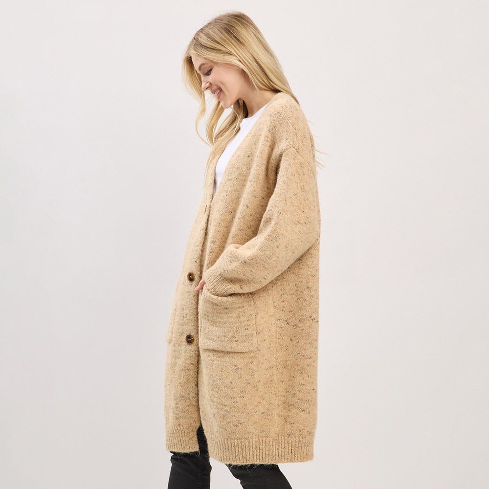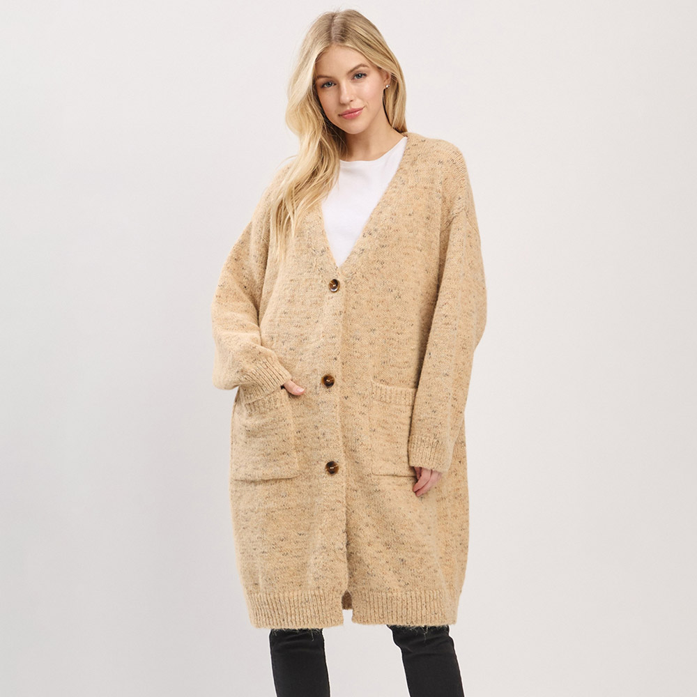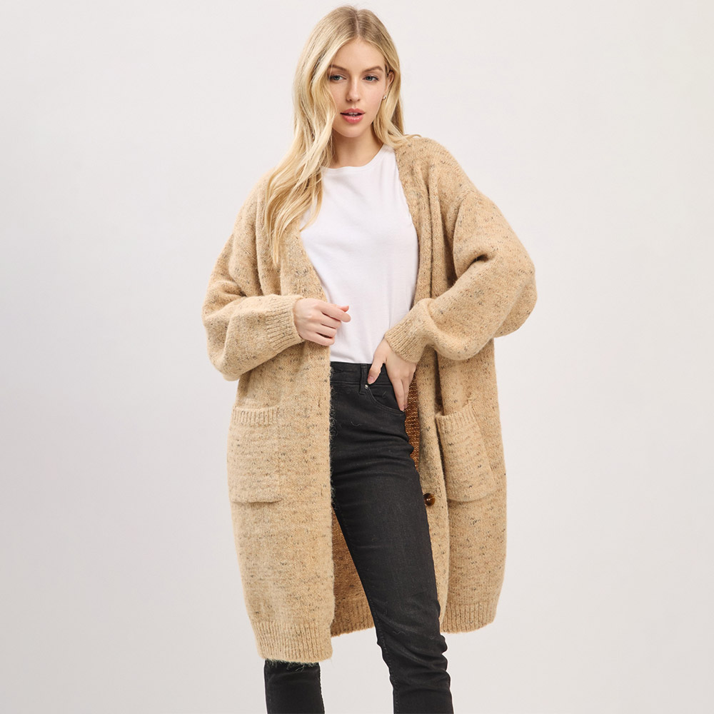 Details • Size : 22" X 38" • Material : 92% Polyester, 8% Wool • Stay cozy in this long knit cardigan featuring a button-front design, roomy front pockets, and a relaxed fit. Perfect for layering over casual outfits during chilly days or lounging in effortless comfort.