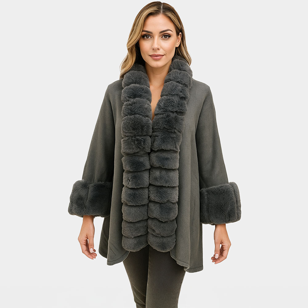 • Wrap yourself in timeless elegance with this faux fur trim cape shawl. Featuring plush detailing along the collar and cuffs, it offers a luxurious touch and exceptional warmth. Perfect for layering over any outfit, this statement piece combines classic sophistication with cozy comfort.
