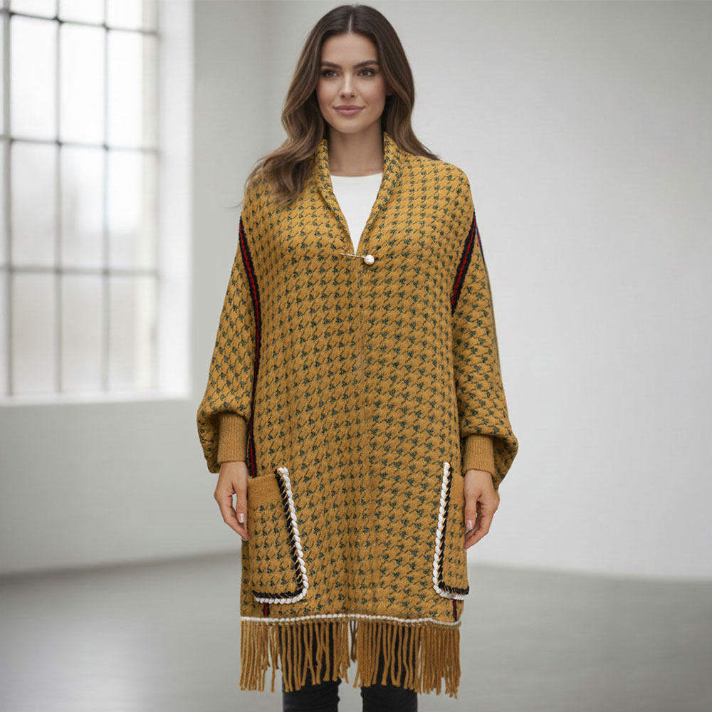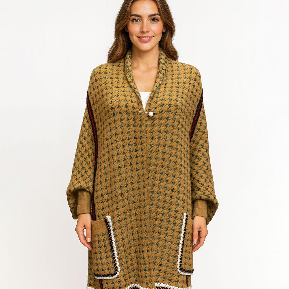 • A chic open-front cardigan wrap featuring an oversized houndstooth pattern, contrast trim, roomy sleeves, and fringe hem. Designed for comfort and style, it layers effortlessly over casual or dressy outfits, making it perfect for everyday wear, travel, or gifting.
