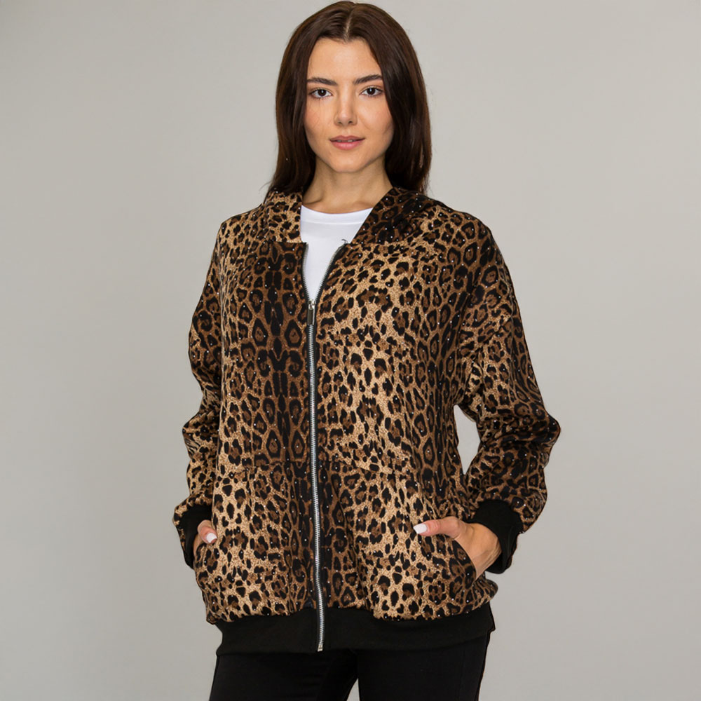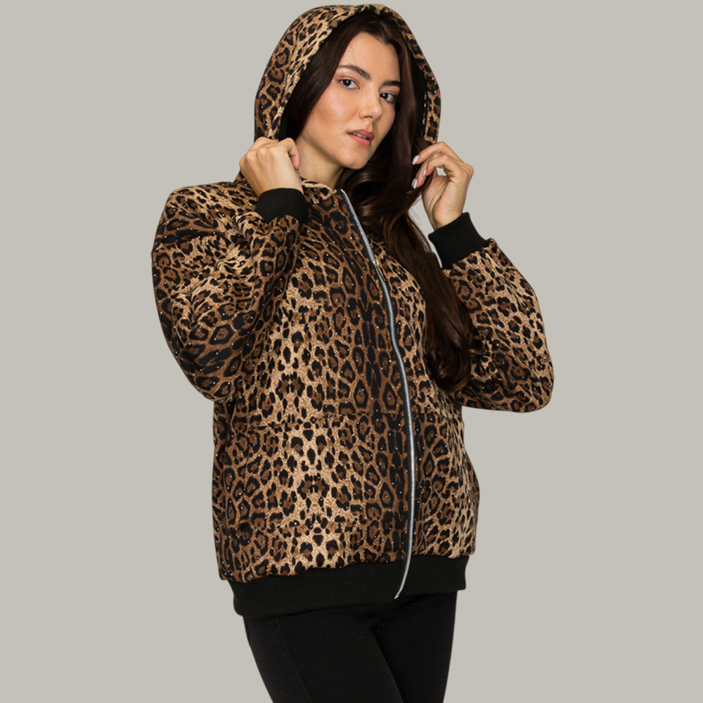 Details • Size : One Size • Material : 100% Polyester • Stylish Rhinestone Studded leopard print zip-up jacket featuring a relaxed silhouette, hooded detail, front pockets and comfortable everyday wear. A versatile animal print layer perfect for casual looks, easy outfitting and adding standout pattern to any wardrobe.