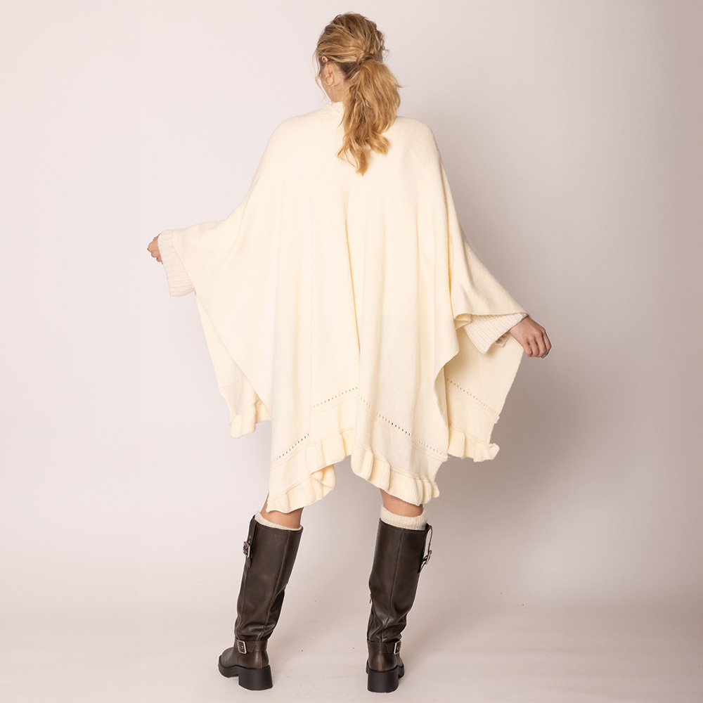 Details • Size : 41.3" X 27.6" • Material : 100% Acrylic • Add charm to your wardrobe with this open front knit cape featuring a flowing silhouette and ruffled hem detailing. Lightweight and versatile, it’s perfect for layering over casual or dressy looks, offering comfort, warmth, and effortless elegance for any season or occasion.