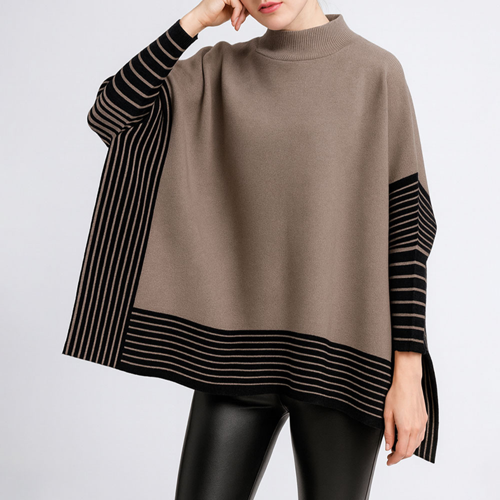 • Stylish poncho top featuring a mock neck, asymmetrical drape, and bold striped accents. A versatile one-size layering piece that offers comfort and modern elegance. Perfect for casual outfits, seasonal transitions, and everyday wear.