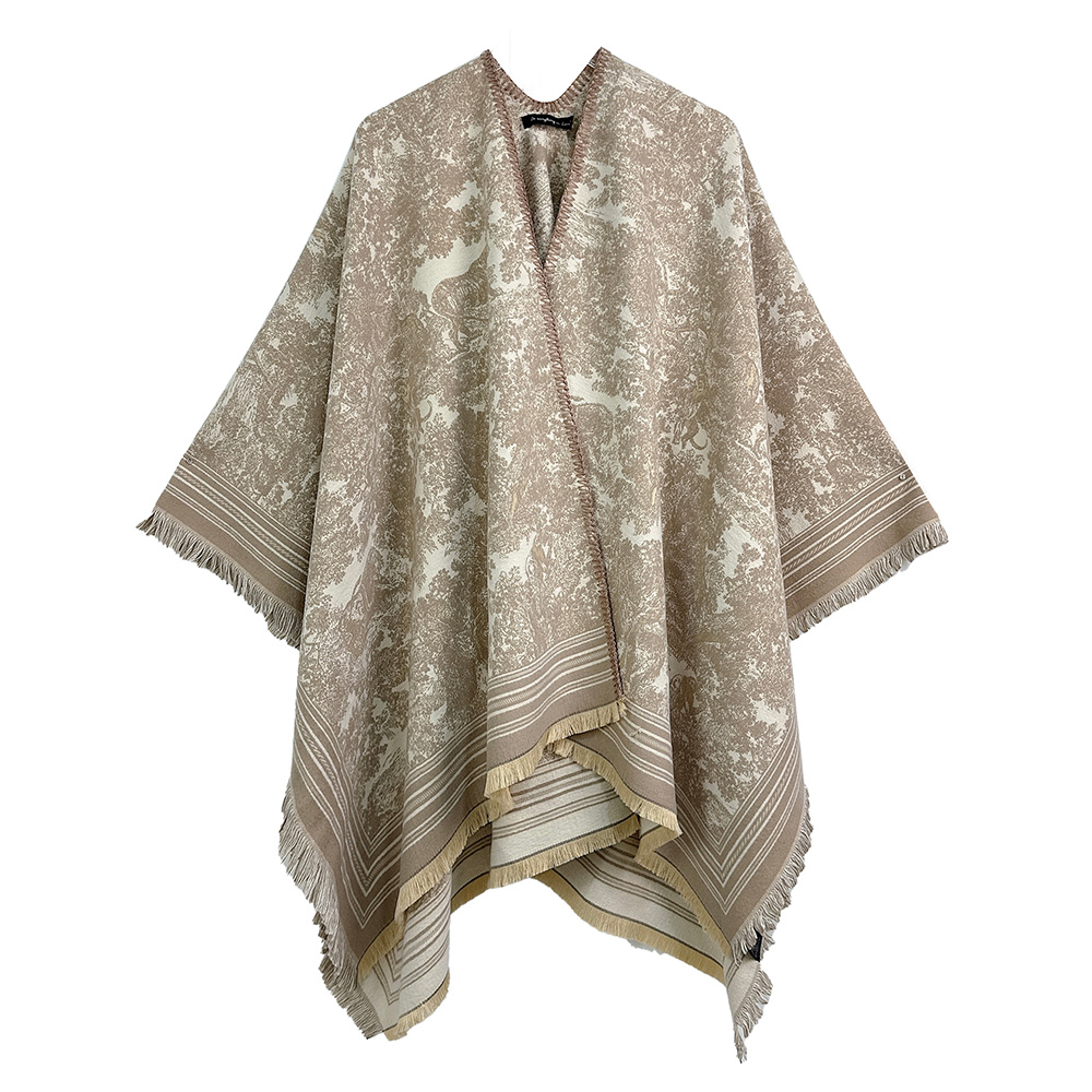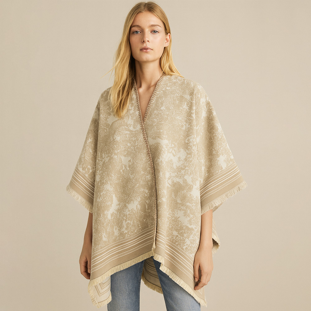 • Add a touch of sophistication to your look with this textured jacquard poncho featuring subtle patterns and delicate fringe detailing. Its soft drape and open-front design make it a versatile layering essential for effortlessly refined everyday style.