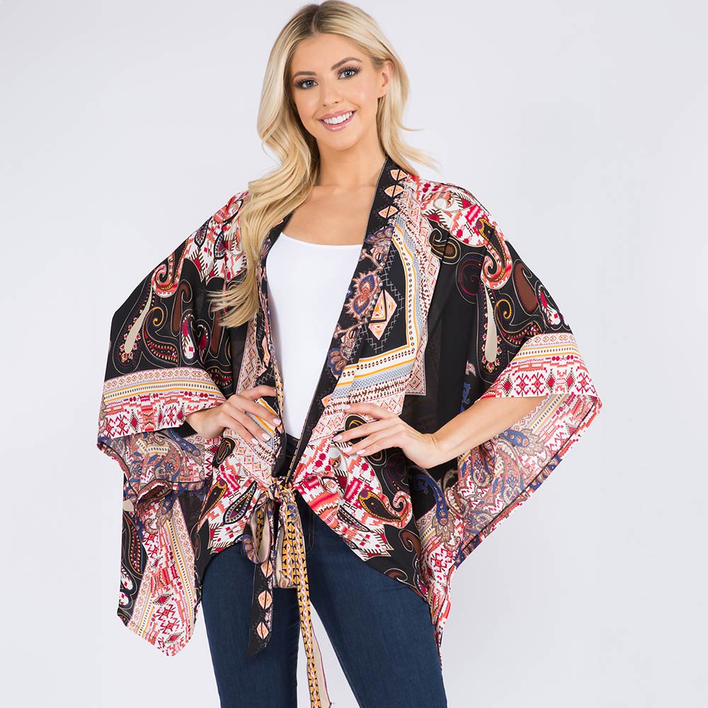 • Statement kimono wrap featuring a bold patchwork-inspired design and adjustable tie-front detail. Designed for effortless layering with a relaxed silhouette that elevates everyday outfits, travel looks, and boutique styling. Ideal as a versatile outer layer for casual wear, festivals, or resort-ready collections.