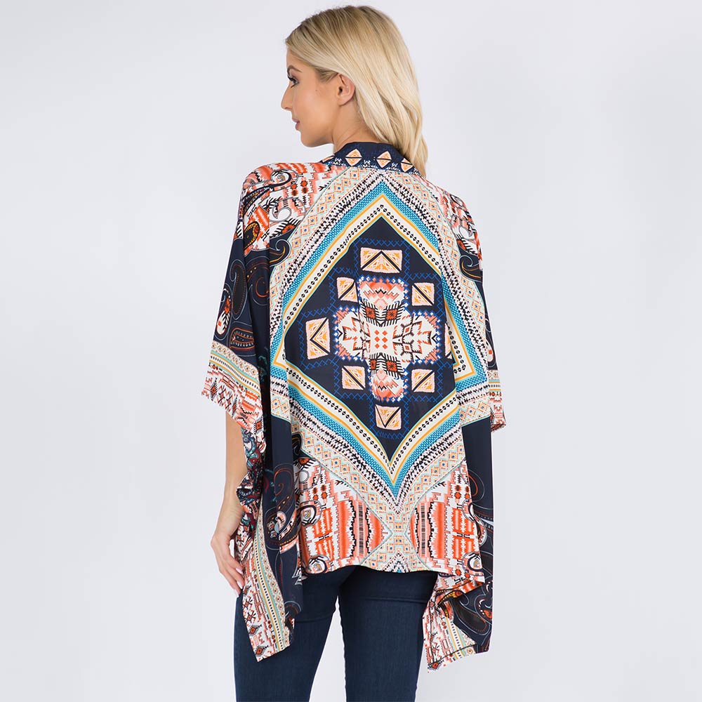 • Statement kimono wrap featuring a bold patchwork-inspired design and adjustable tie-front detail. Designed for effortless layering with a relaxed silhouette that elevates everyday outfits, travel looks, and boutique styling. Ideal as a versatile outer layer for casual wear, festivals, or resort-ready collections.