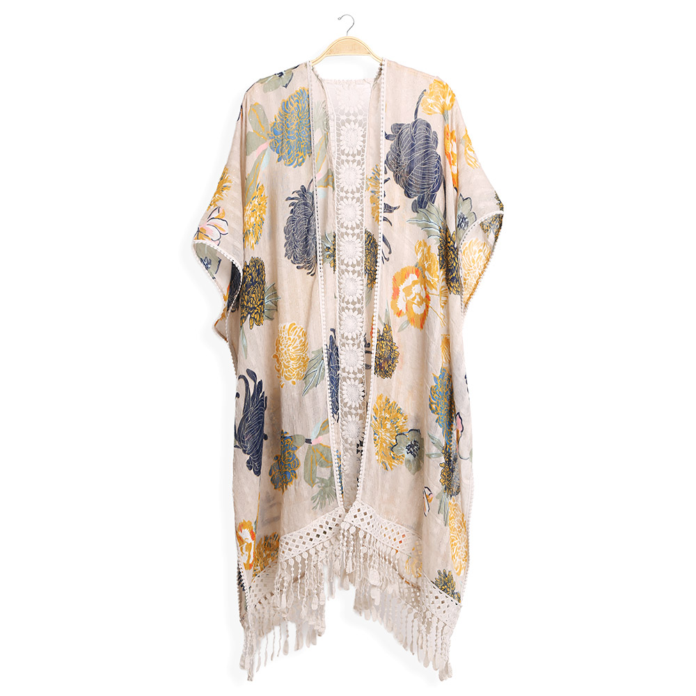 Floral Printed Cover Up Kimono Poncho With Tassels