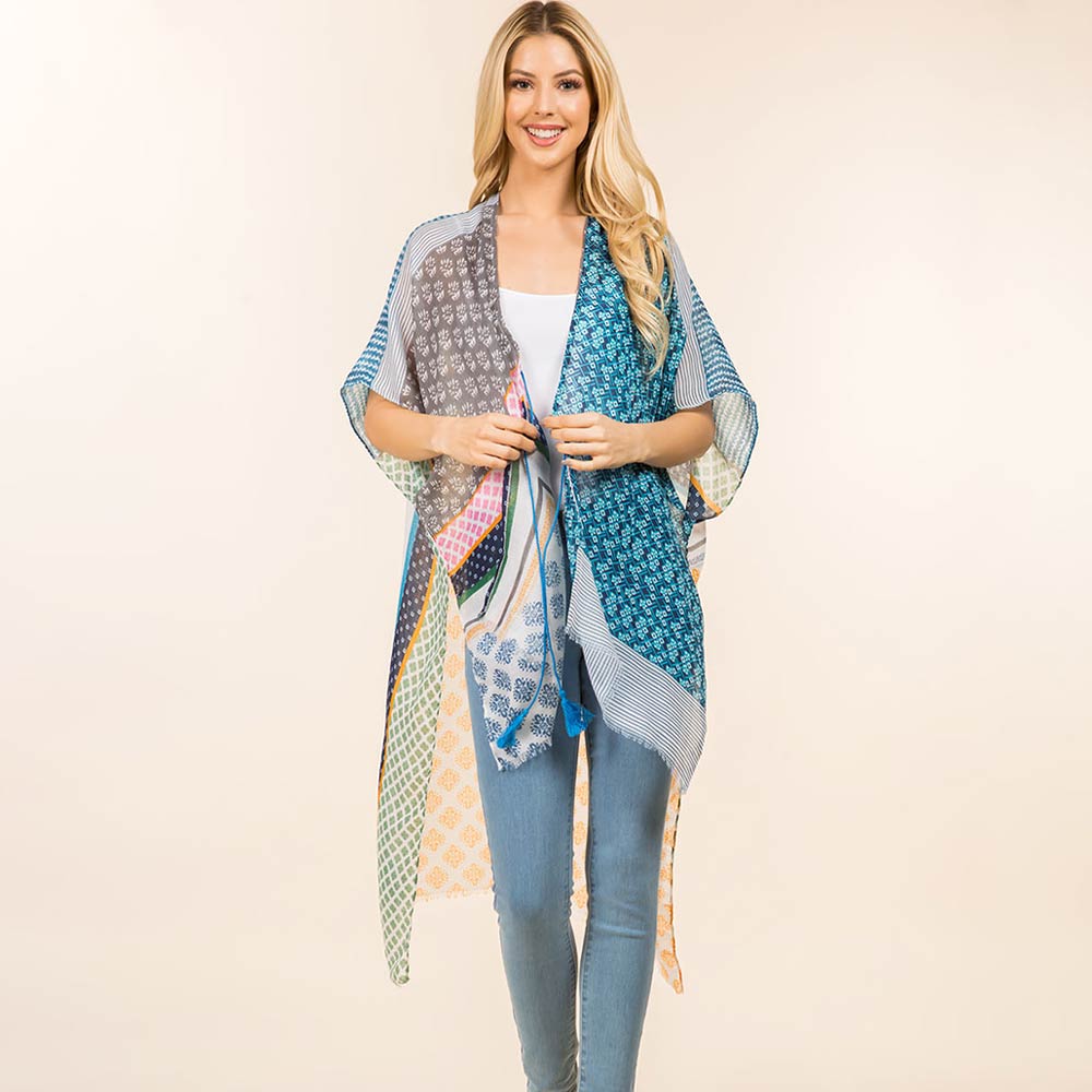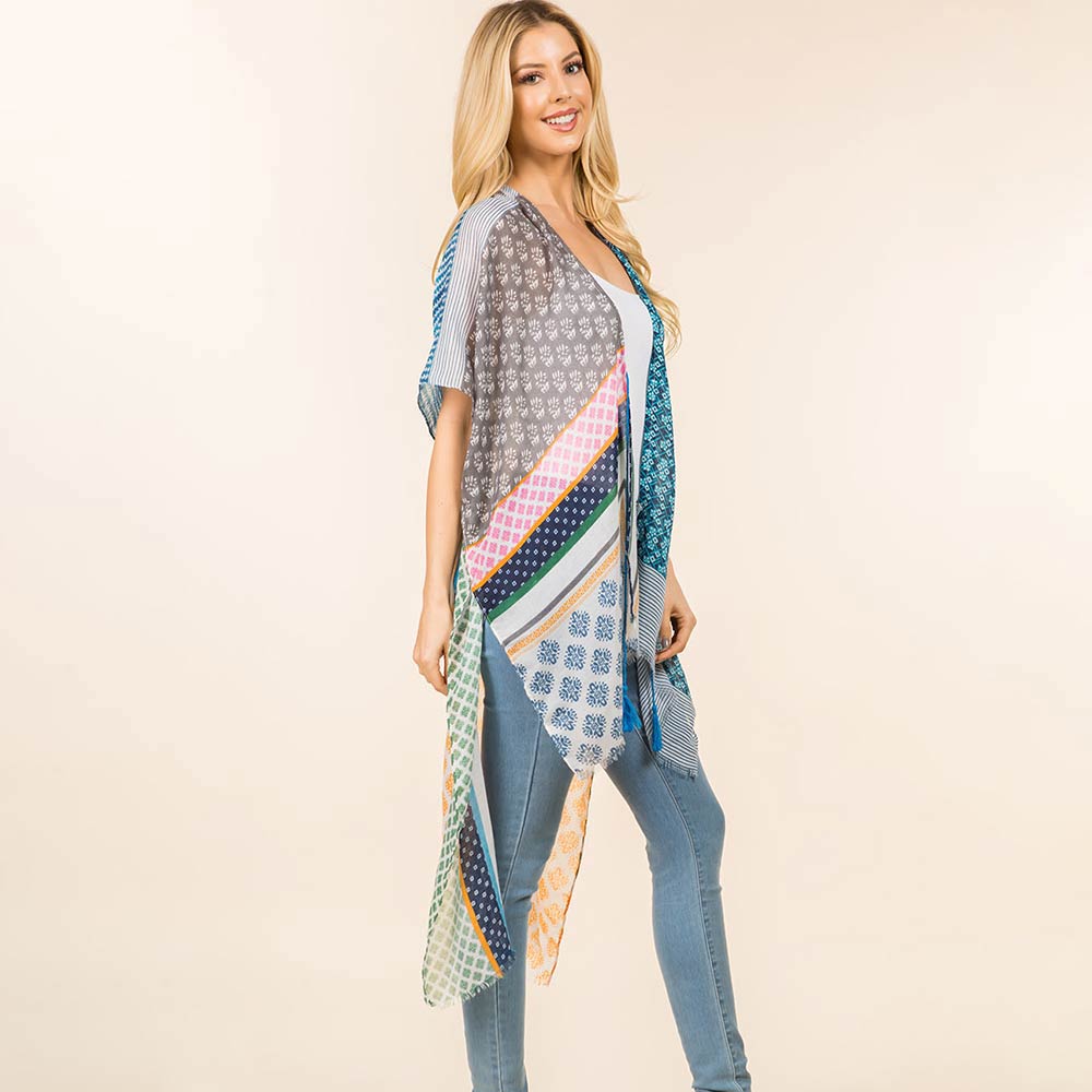 • Effortlessly elevate everyday outfits with this patchwork print open front kimono. Designed for versatile layering, it drapes beautifully over casual or dressy looks. A lightweight statement piece perfect for boutiques, seasonal styling, and trend-focused collections.