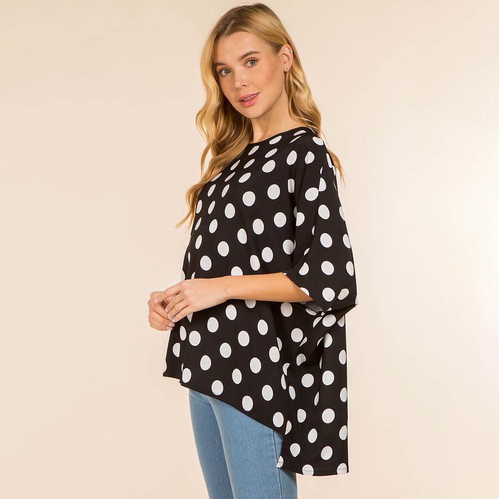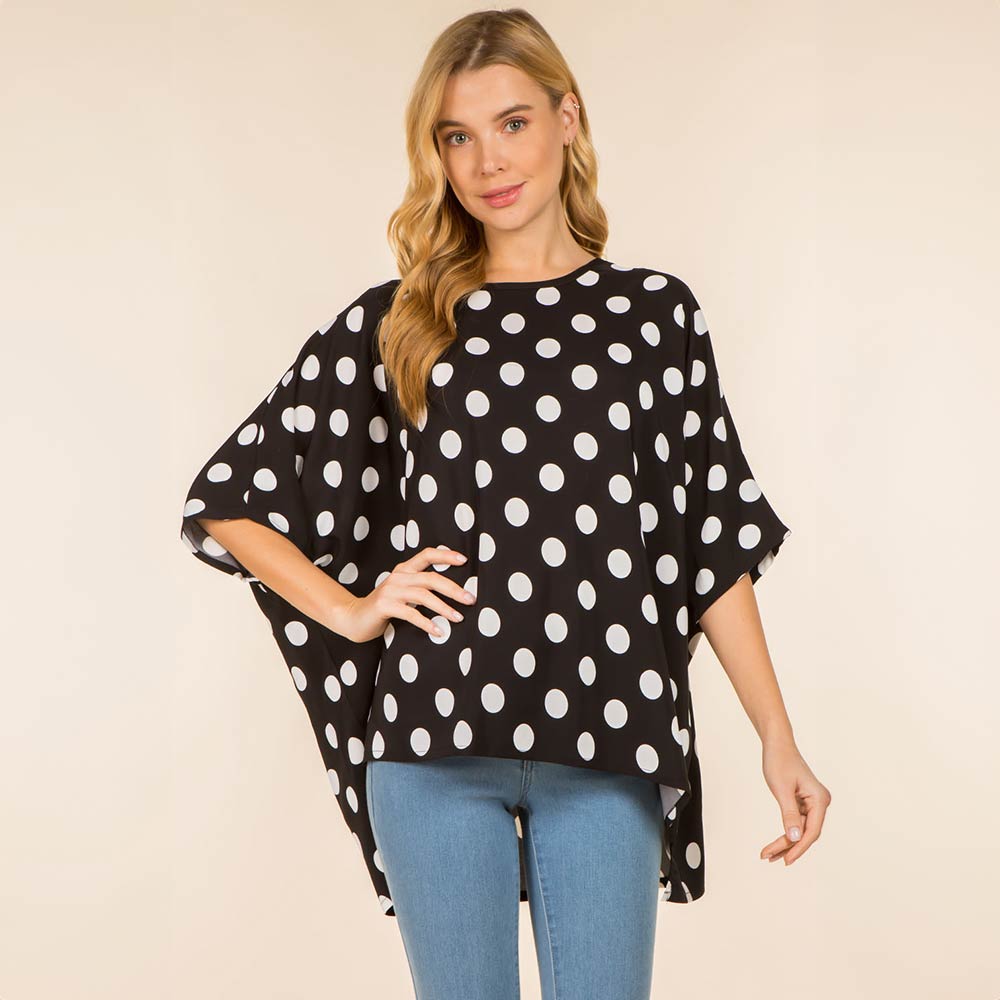 • Flowy poncho-style top designed with an allover polka dot pattern and a relaxed silhouette for effortless comfort and style. Drapes beautifully for everyday wear, travel, or casual outings. Easy to pair with jeans or leggings, making it a versatile fashion piece for gifting and boutique collections.