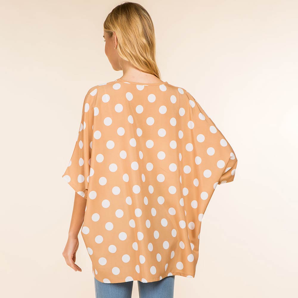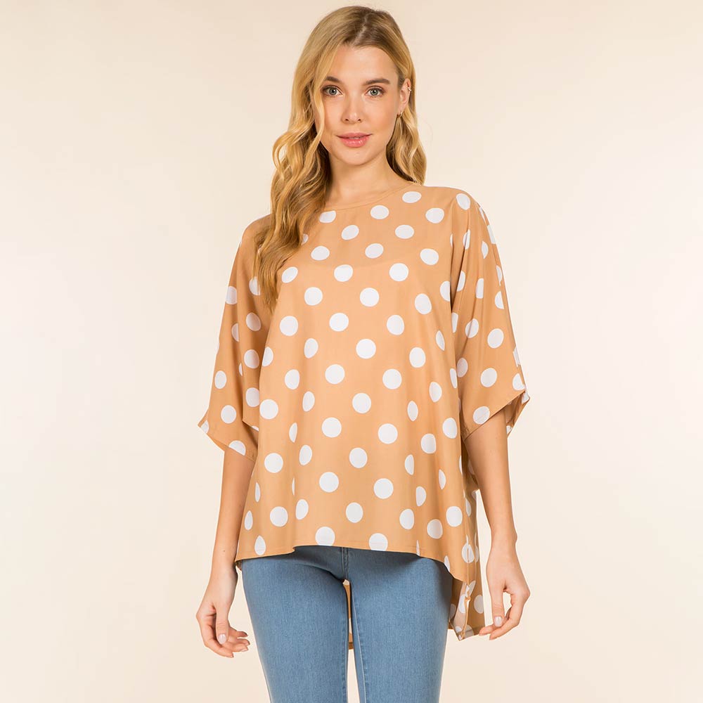 Details • Size : One Size • Material : 100% Polyester • Flowy poncho-style top designed with an allover polka dot pattern and a relaxed silhouette for effortless comfort and style. Drapes beautifully for everyday wear, travel, or casual outings. Easy to pair with jeans or leggings, making it a versatile fashion piece for gifting and boutique collections.