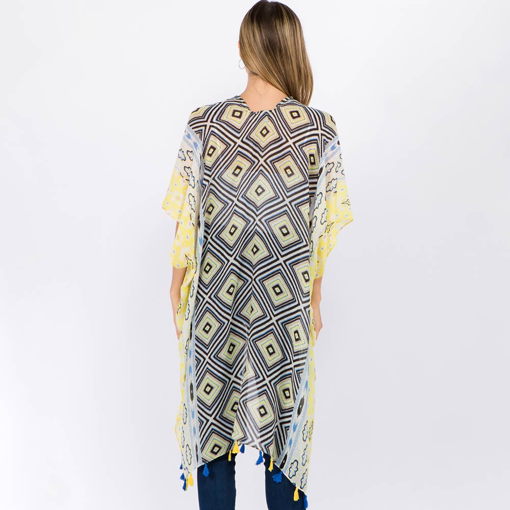 • Statement kimono cover up featuring an eye-catching geometric pattern and flowing open-front design. Finished with tassel accents for added movement, this versatile layering piece is ideal for boutique displays, resort wear edits, and effortless styling from casual outings to vacation looks.