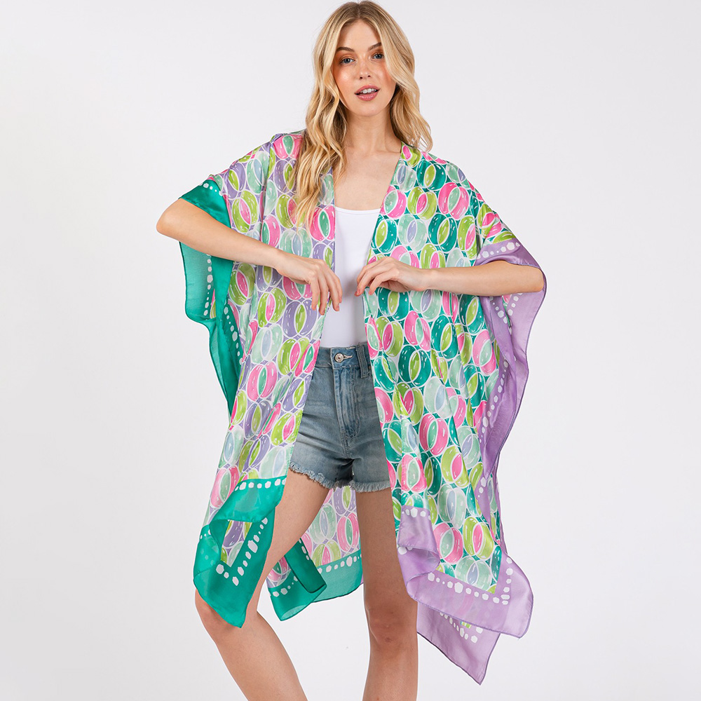 Two Tone Trim Abstract Print Silky Feel Kimono Poncho