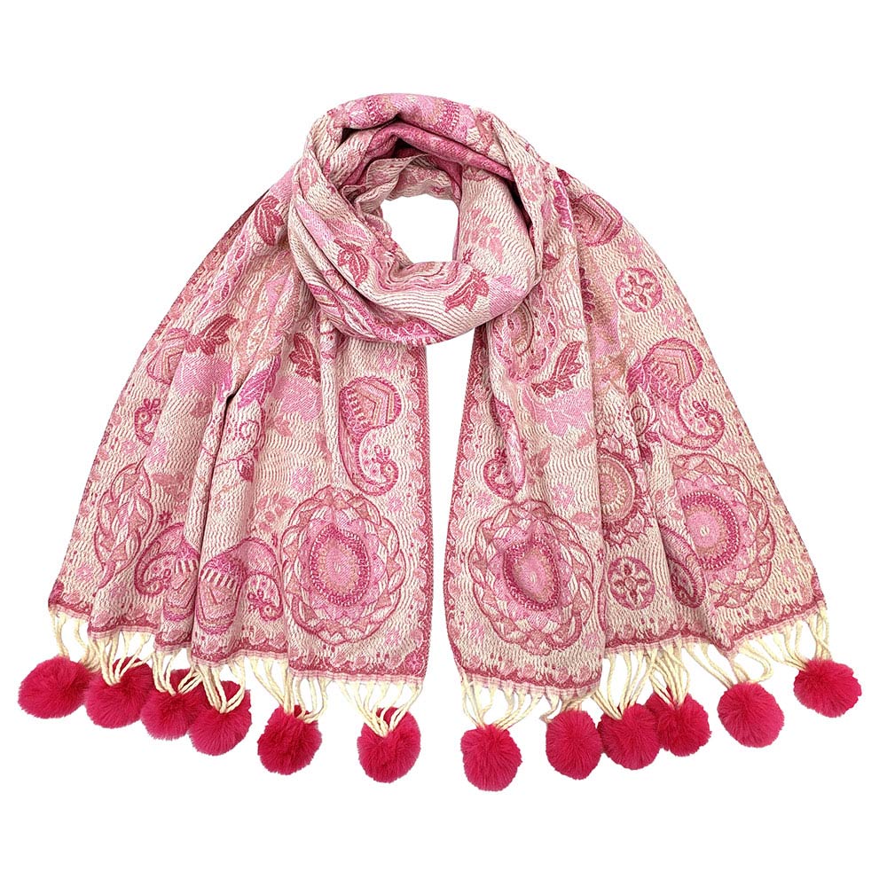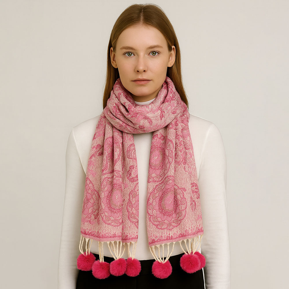• Add a touch of sophistication to any outfit with this beautifully patterned scarf featuring soft pom tassel accents. Its cozy, lightweight design drapes effortlessly, making it perfect for elevating everyday looks and adding stylish warmth throughout the season.