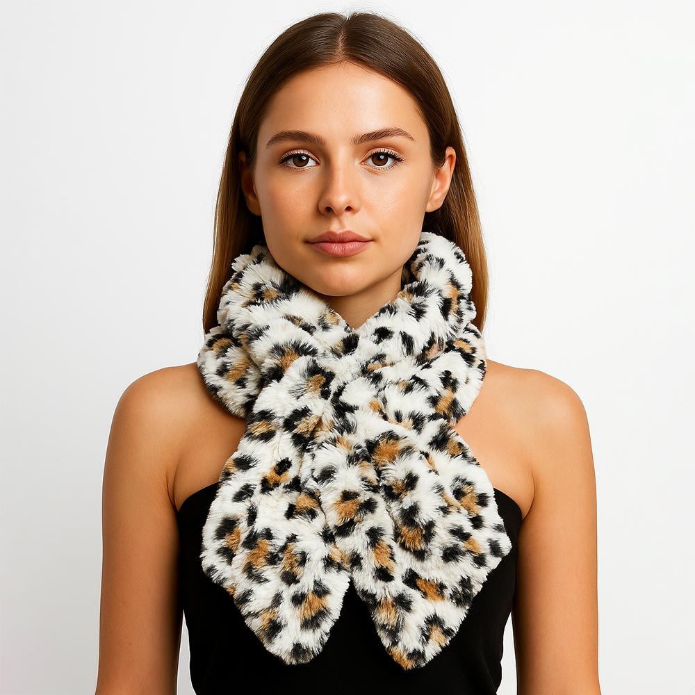 • Plush faux fur slip-through scarf designed with a bold animal print pattern. This cozy winter accessory combines warmth and style, making it perfect for layering with casual or dressy outfits. A soft, fashionable piece that elevates cold-weather looks effortlessly.