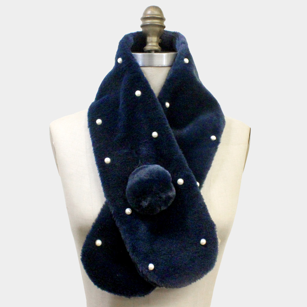 Pearl Embellished Faux Fur Pom Pom Pull Through Scarf Pearl Embellished Faux Fur Pom Pom Pull Through Scarf