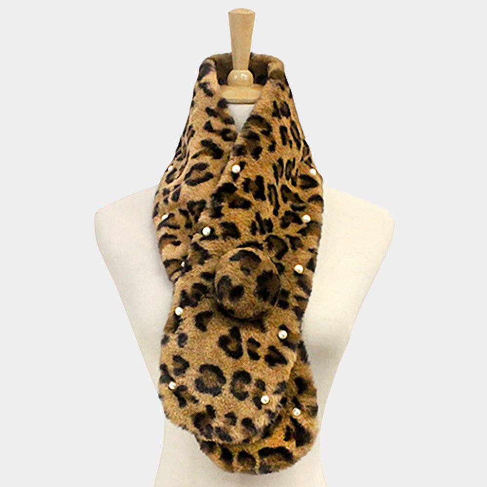 Pearl Embellished Leopard Patterned Faux Fur Pom Pom Pull Through Scarf