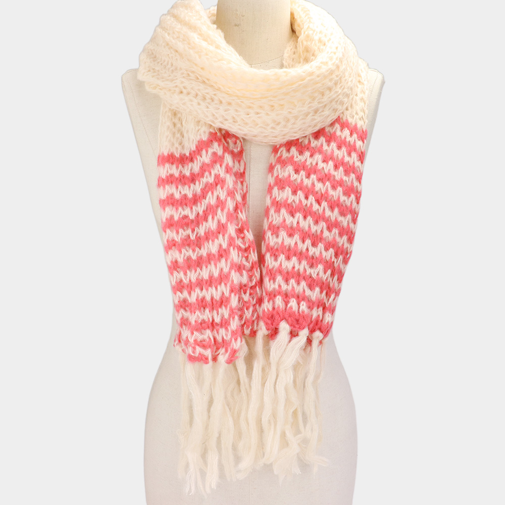Two Tone Knit Striped Fringe Oblong Scarf