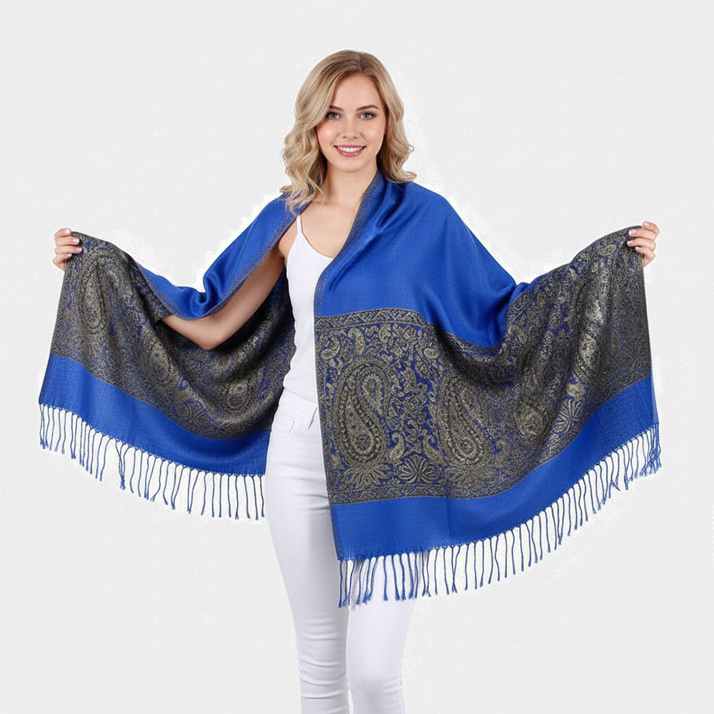 Details • Size : 28" X 78" • Material : 100% Pashmina • Elegant paisley shawl wrap with fringed edges, available in assorted styles for versatile wear. Perfect as a scarf, wrap, or cover-up, this timeless accessory enhances both casual and formal looks. Lightweight and stylish, it makes an excellent addition to wardrobes for year-round layering.