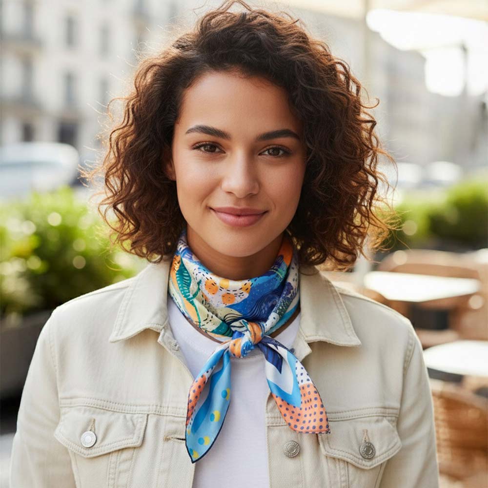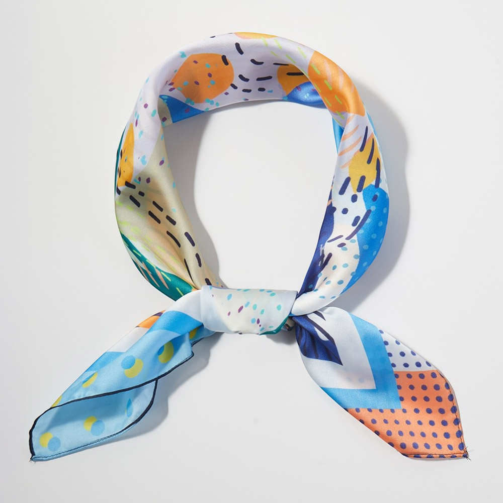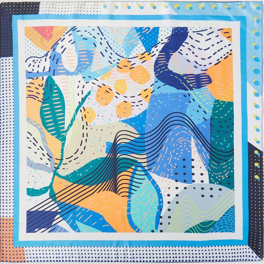• Square fashion scarf featuring an expressive abstract art design with dynamic shapes and flowing patterns. Designed for versatile styling as a neck scarf, hair accessory, or bag accent, making it ideal for boutiques seeking modern statement accessories with everyday wear appeal and seasonal flexibility.