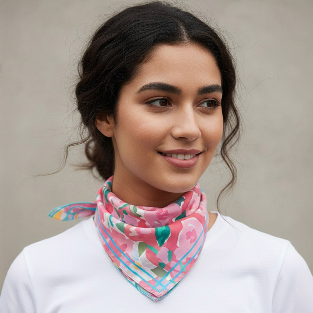 • Elegant square fashion scarf featuring a soft, painterly floral garden design. Ideal for refined everyday styling on the neck, hair, wrist, or handbag, this versatile accessory adds a graceful, feminine touch to casual looks, office outfits, and boutique-ready fashion collections.