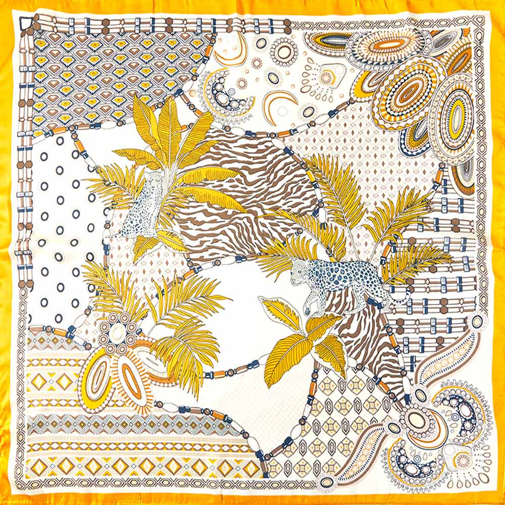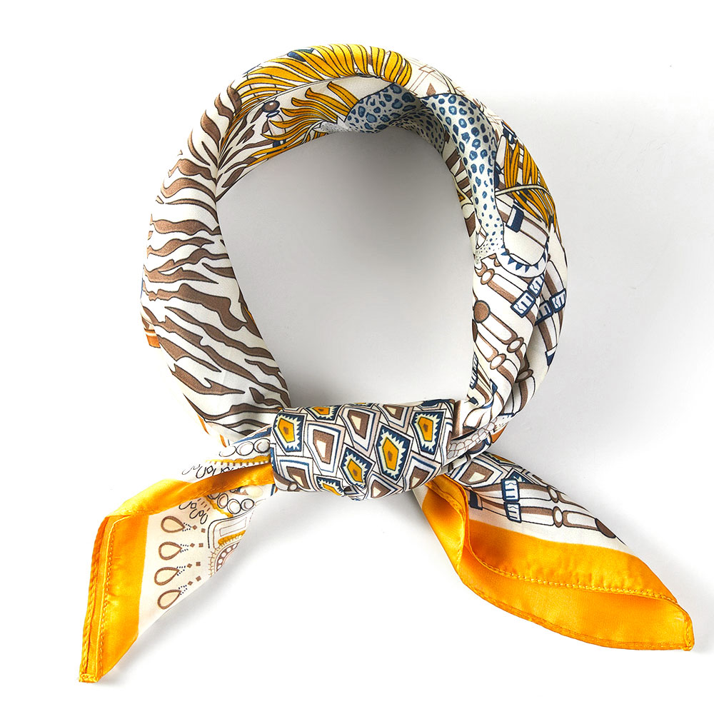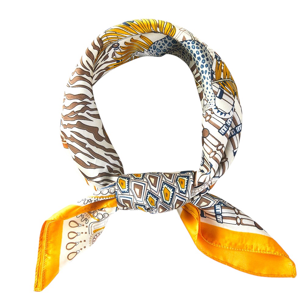 Details • Size : 27.5" X 27.5" • Material : 100% Polyester • Chic square fashion scarf featuring a tropical leopard and palm motif with smooth, lightweight drape for versatile styling. Perfect as a neck scarf, hair accessory, or handbag accent, adding an exotic and stylish touch to everyday outfits, travel looks, and special occasions. A trendy gift for fashion lovers.