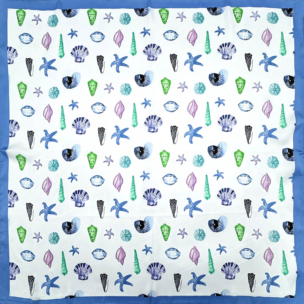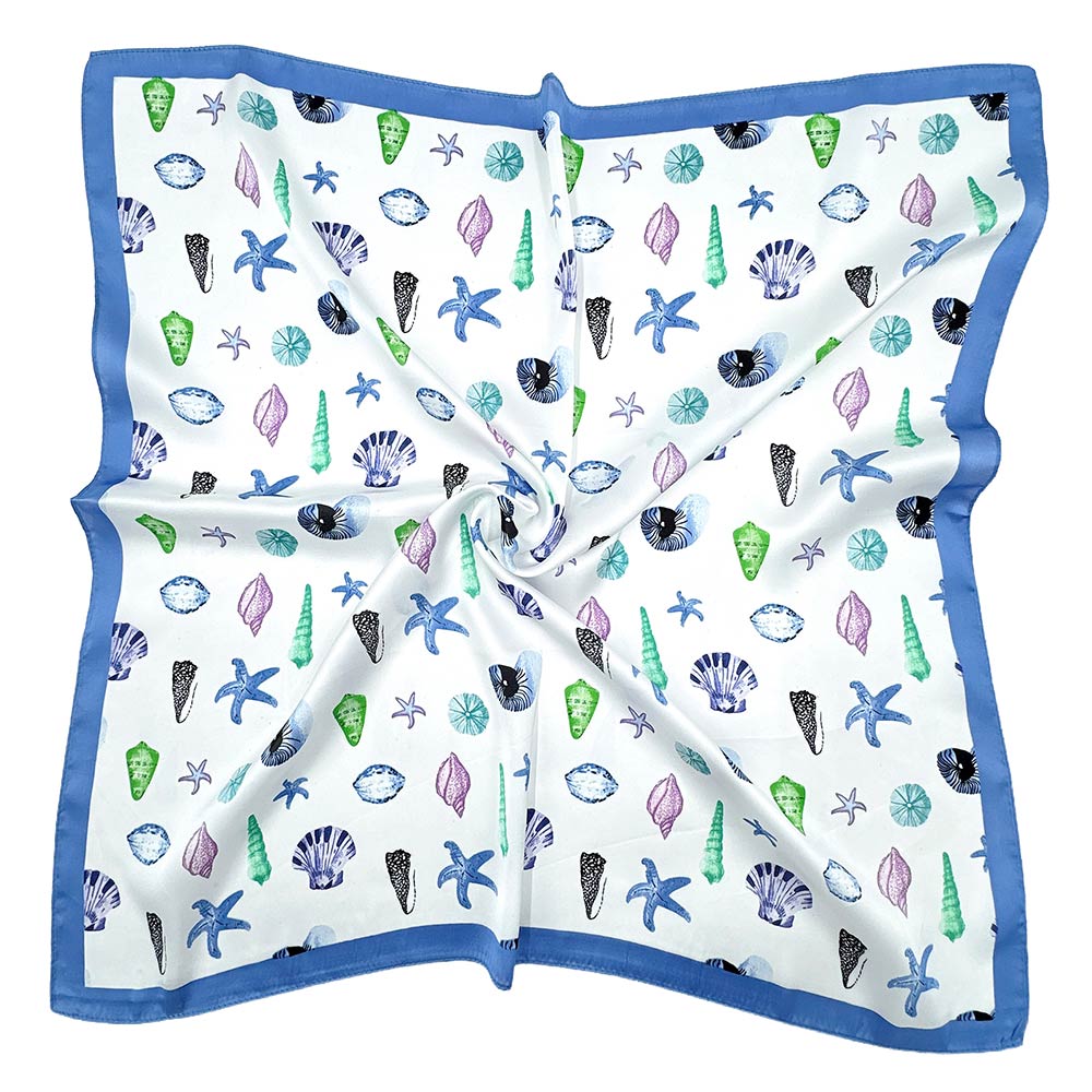 Details • Size : 27.6" X 27.6" • Material : 100% Polyester • This square fashion scarf features a playful sea life pattern with starfish, shells, and ocean-inspired motifs for a fresh, coastal feel. Designed for versatile styling around the neck, hair, or handbag, it adds personality to casual and resort looks. Ideal for seasonal collections, beach boutiques, gifts, and everyday accessorizing with a fun, nature-inspired touch.
