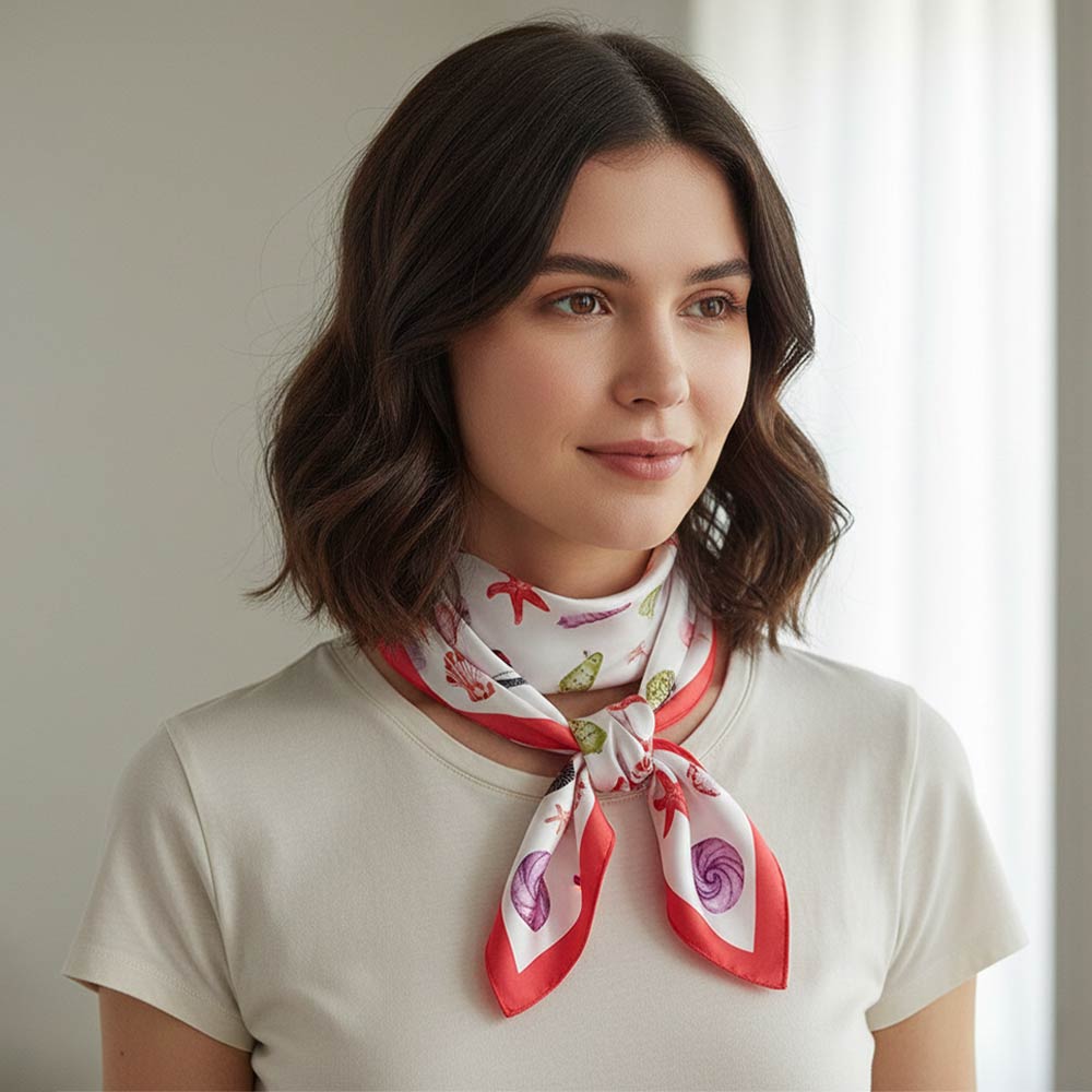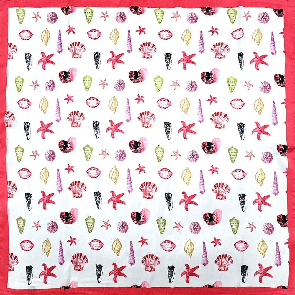 Details • Size : 27.6" X 27.6" • Material : 100% Polyester • This square fashion scarf features a playful sea life pattern with starfish, shells, and ocean-inspired motifs for a fresh, coastal feel. Designed for versatile styling around the neck, hair, or handbag, it adds personality to casual and resort looks. Ideal for seasonal collections, beach boutiques, gifts, and everyday accessorizing with a fun, nature-inspired touch.