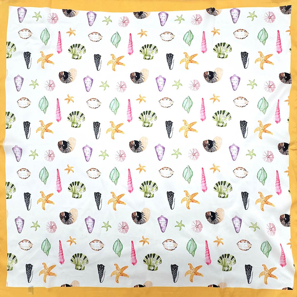 • This square fashion scarf features a playful sea life pattern with starfish, shells, and ocean-inspired motifs for a fresh, coastal feel. Designed for versatile styling around the neck, hair, or handbag, it adds personality to casual and resort looks. Ideal for seasonal collections, beach boutiques, gifts, and everyday accessorizing with a fun, nature-inspired touch.