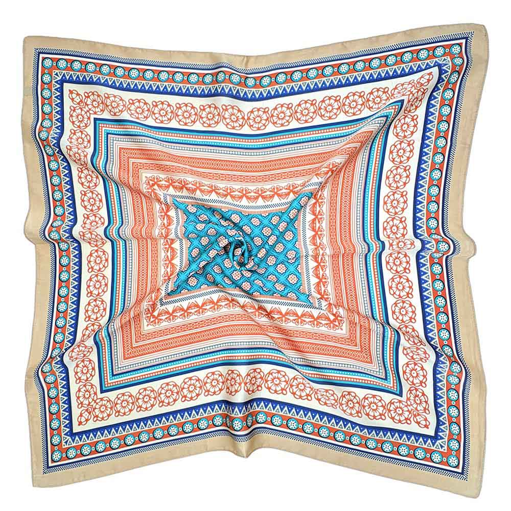 • This square fashion scarf features an intricate geometric center framed by layered floral and ornamental borders, creating a balanced and eye-catching design. Easy to style around the neck, as a hair accessory, or tied to a handbag, it adds a refined accent to casual and dressy looks. A versatile, pattern-driven accessory ideal for boutique collections seeking statement scarves with timeless appeal and multiple styling options.