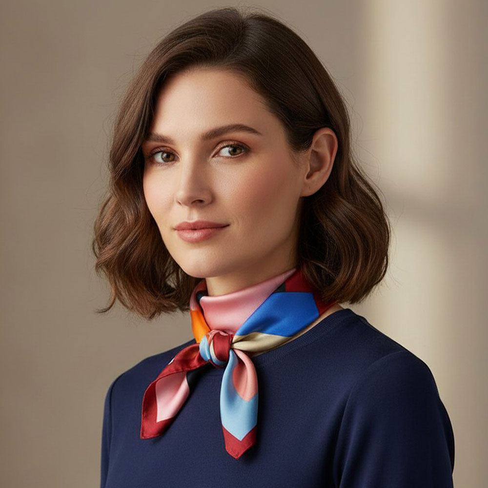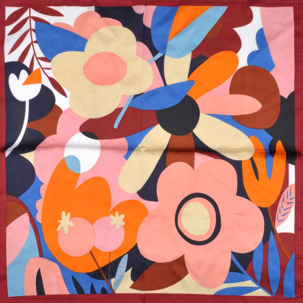 • Add vibrant elegance to any outfit with this square scarf featuring an expressive abstract floral design. Its bold, artistic pattern elevates everyday looks, making it a standout accessory for styling around the neck, hair, or handbag with ease.