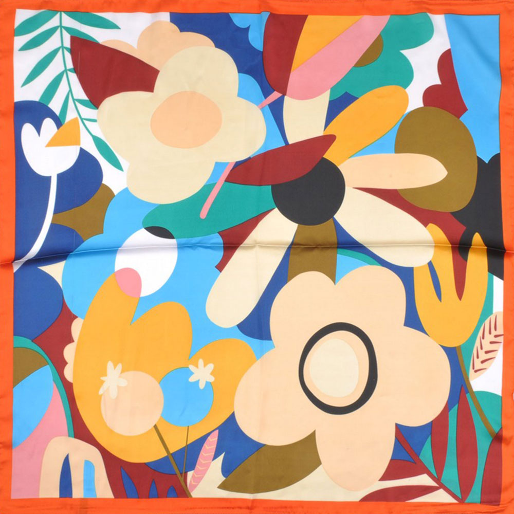 Details • Size : 27.5" X 27.5" • Material : 100% Polyester • Add vibrant elegance to any outfit with this square scarf featuring an expressive abstract floral design. Its bold, artistic pattern elevates everyday looks, making it a standout accessory for styling around the neck, hair, or handbag with ease.
