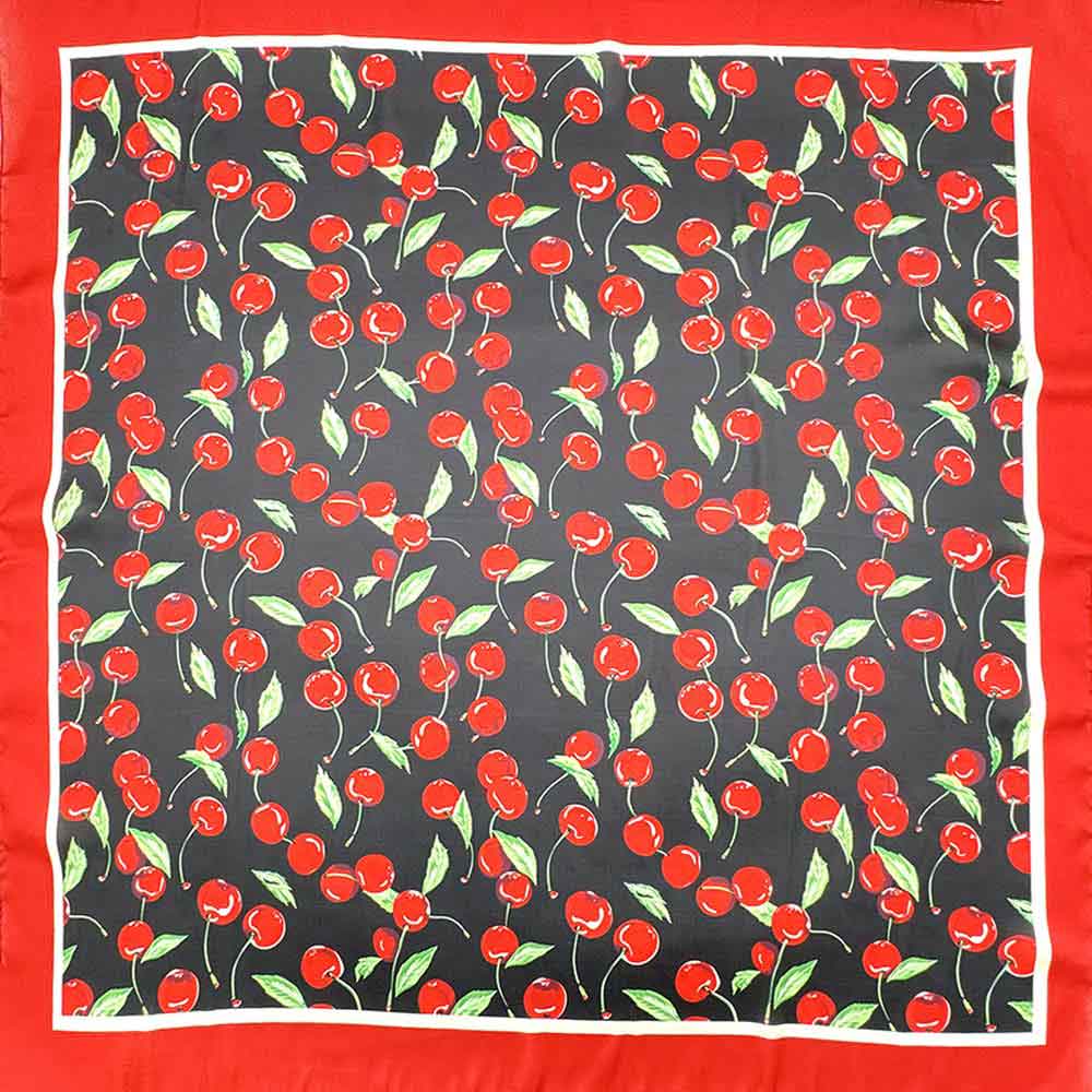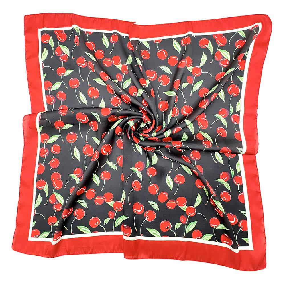 Details • Size : 27.6" X 27.6" • Material : 100% Polyester • This square fashion scarf features a playful cherry-inspired print with a classic bordered layout, offering a bold yet timeless accessory option. Ideal for styling around the neck, hair, bag handles, or wrists, it adds personality to everyday and seasonal looks. A versatile scarf choice for boutiques seeking trend-forward accessories with strong visual appeal, easy styling flexibility, and broad customer appeal for casual, retro, and statement outfits.