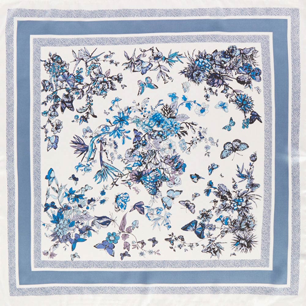 • Float into style with this exquisite square scarf, featuring a dense, beautiful print reminiscent of Chinoiserie or toile designs. The pattern is filled with delicate butterflies and lush, detailed floral bouquets primarily in beautiful shades of blue and white, framed by a striped border. Made from a smooth, satin-feel fabric, this elegant accessory adds a layer of intricate beauty and sophistication to any look.