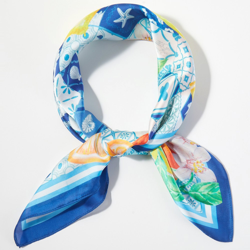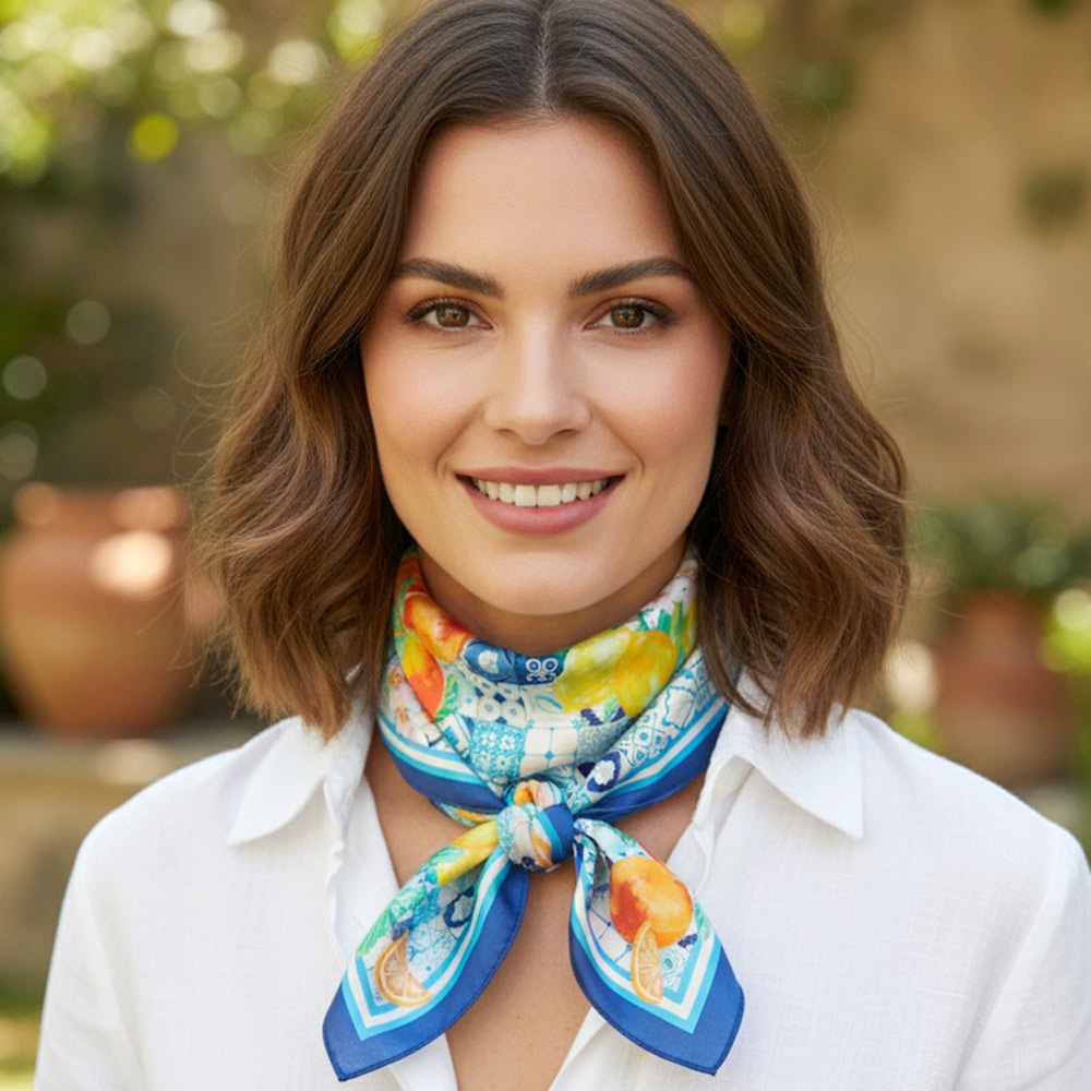• Eye-catching square fashion scarf featuring a lively citrus fruit and botanical motif with decorative tile-inspired detailing. Designed for versatile styling on the neck, hair, wrist, or handbag. A statement accessory perfect for boutique collections, resort themes, and everyday outfit layering.