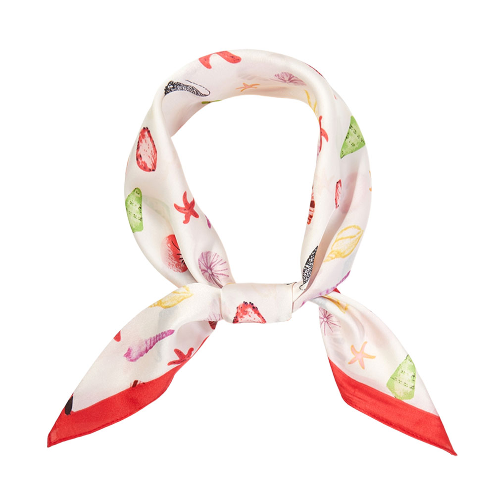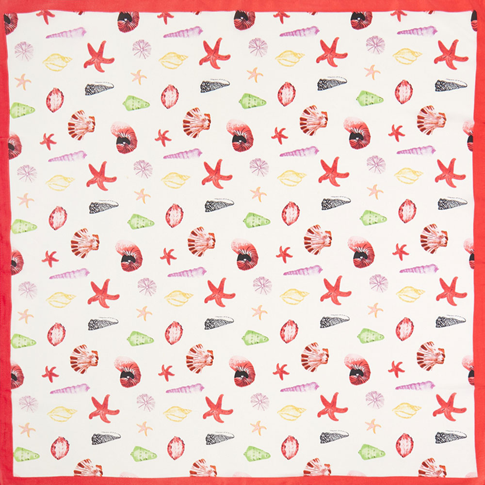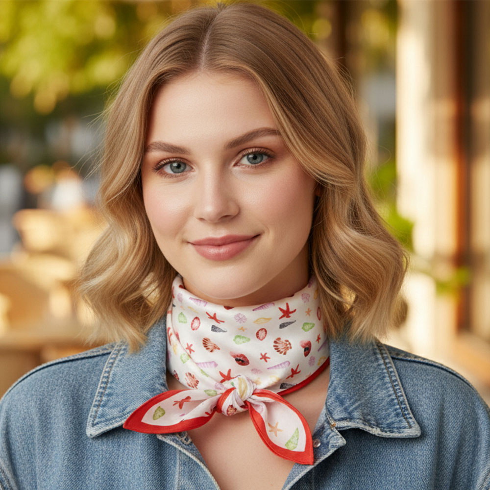 • Bring ocean-inspired charm to any outfit with this coastal print square scarf featuring playful starfish, seashells, and sea-treasures in cool blue and green tones. Designed with a bright blue border, it’s perfect for styling as a neck scarf, hair accessory, or handbag tie. A fun beach-day accent that adds breezy summer vibes to casual and vacation looks.