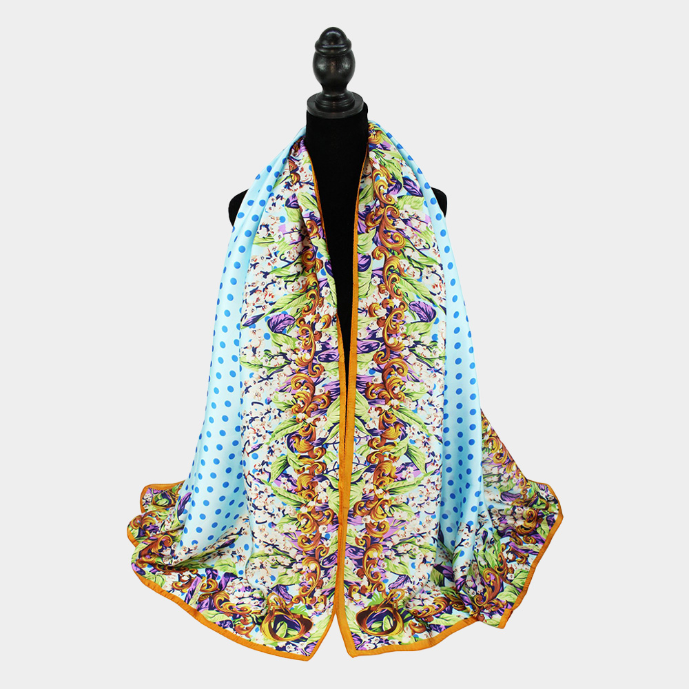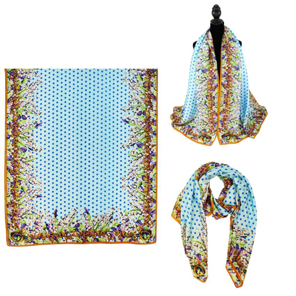 Flower Polka Dot Pattern Printed Oblong Silky Satin Scarf Shawl