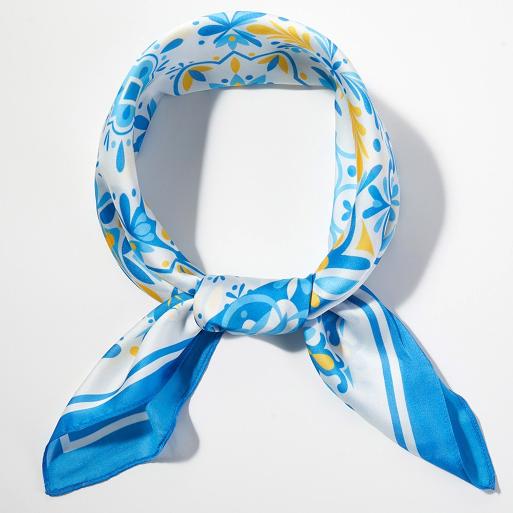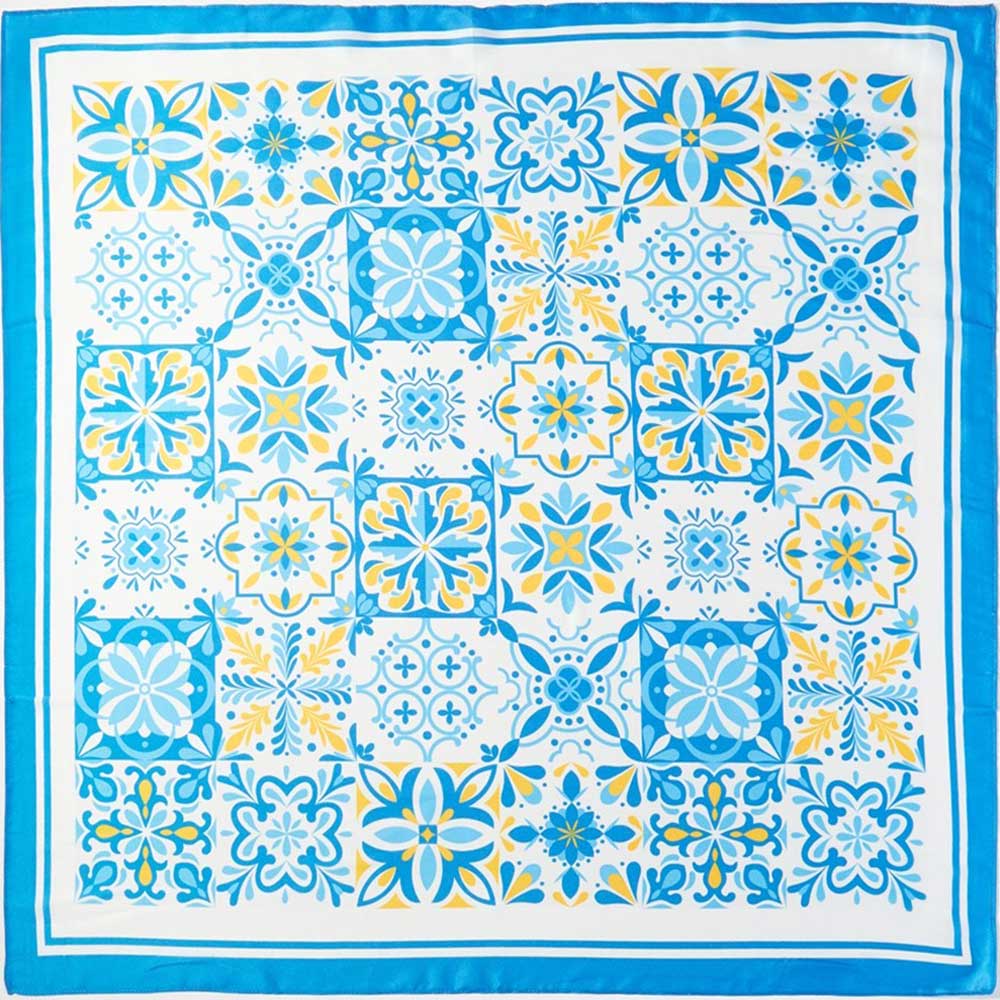 • Eye-catching square fashion scarf featuring an intricate Mediterranean tile-inspired pattern. Designed for versatile styling on the neck, hair, wrist, or handbag, this statement accessory adds artistic flair and boutique appeal to everyday outfits, resort looks, and curated fashion collections.