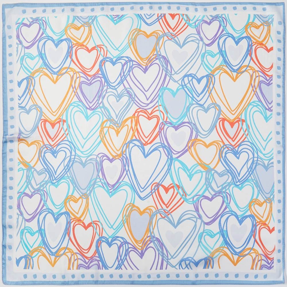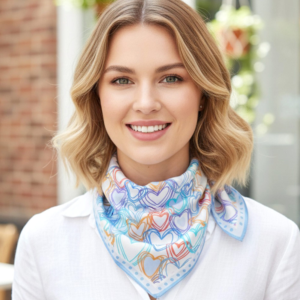• Charming square scarf featuring an allover heart pattern with a playful, artistic layout. Designed for versatile styling around the neck, hair, wrist, or handbag. A trendy accessory ideal for gift shops, boutiques, seasonal displays, and everyday fashion looks.