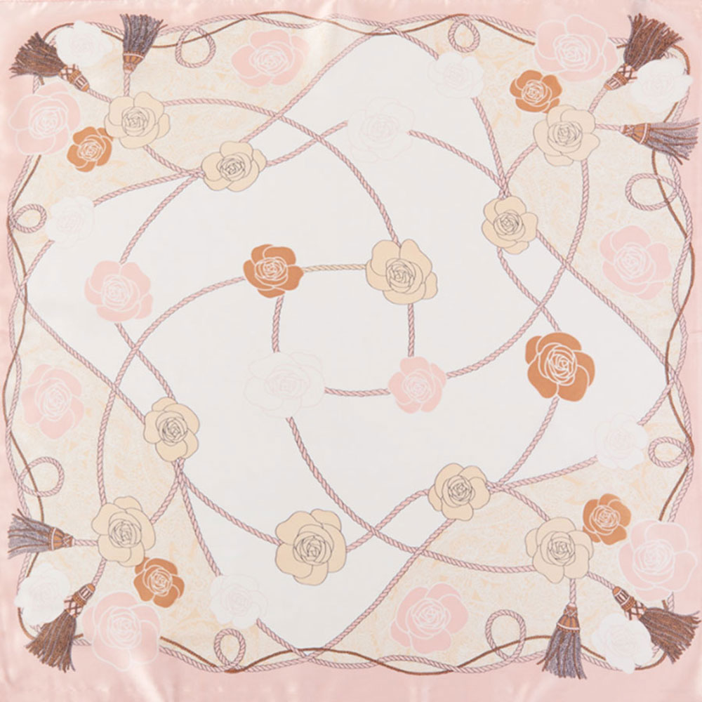 • Capture a chic, preppy look with this charming square satin-feel scarf. The unique design features stylized roses connected by an intertwined rope pattern, framed by a decorative tassel border and subtle paisley elements. The smooth, luxurious fabric and vibrant, balanced colors make this accessory a delightful statement piece for a classic, sophisticated style. Perfect as a neckerchief or tied to a handbag.