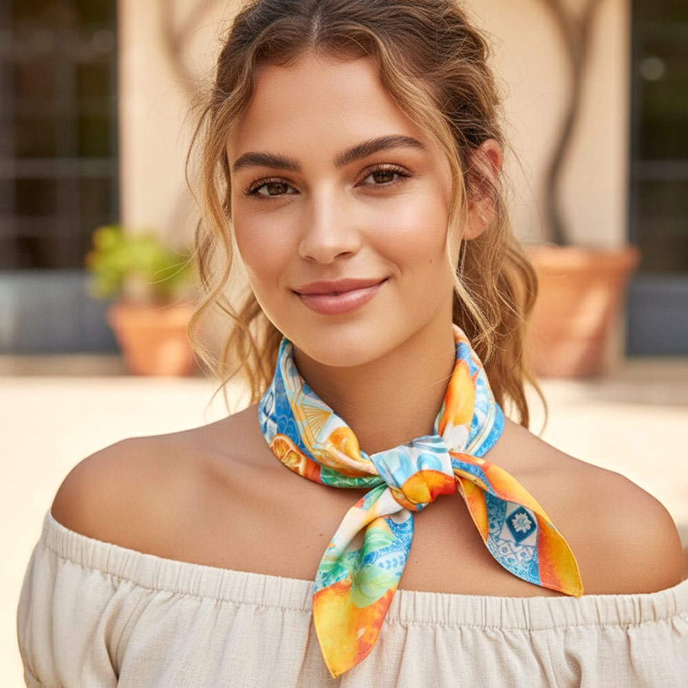 • Statement square scarf featuring an artistic citrus fruit and floral motif with an ornate medallion center and decorative border. Designed for versatile styling on the neck, hair, handbag, or wrist. Ideal for boutique assortments, seasonal displays, and everyday fashion-forward accessorizing.