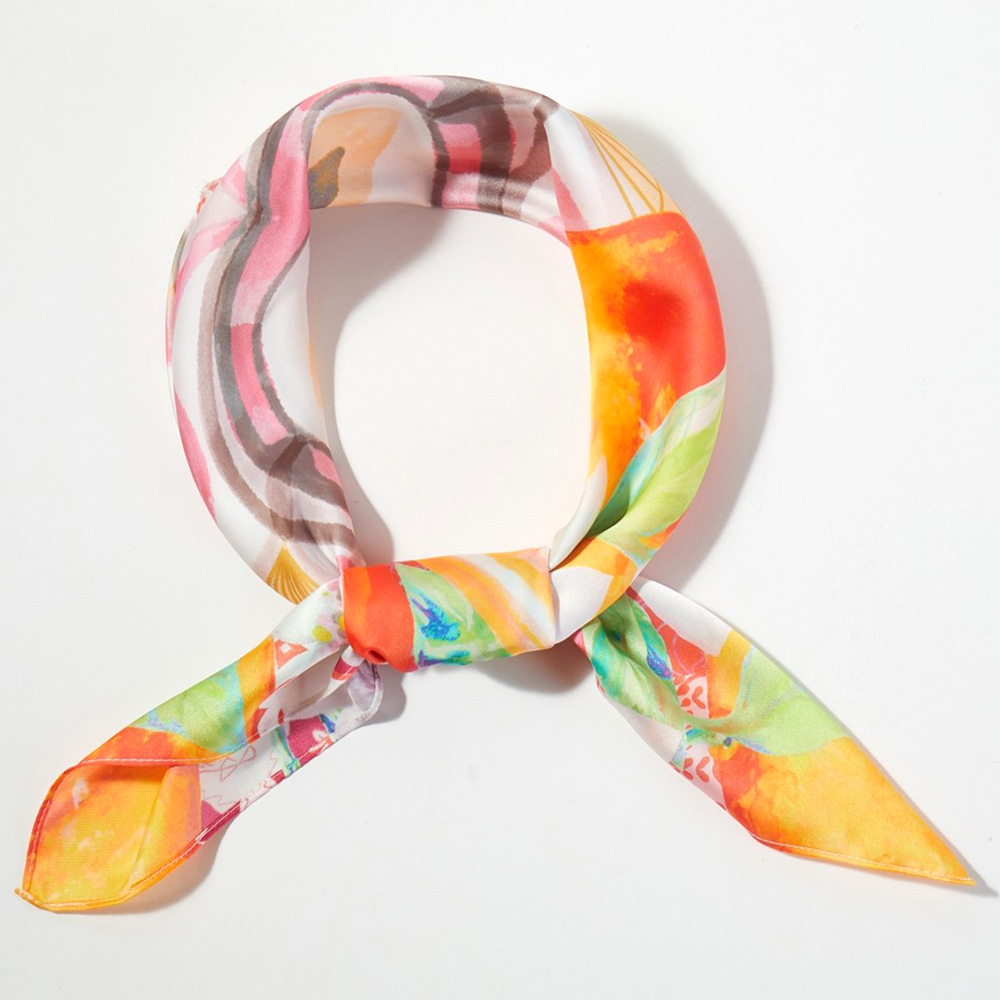 • Statement square scarf featuring an artistic citrus fruit and floral motif with an ornate medallion center and decorative border. Designed for versatile styling on the neck, hair, handbag, or wrist. Ideal for boutique assortments, seasonal displays, and everyday fashion-forward accessorizing.