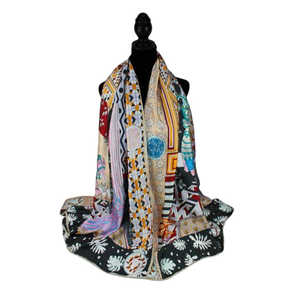 Details • Size : 35" X 78" • Material : 100% Viscose • Breathable, Lightweight, Skin-friendly and Soft • This artistic square scarf features an intricate elephant centerpiece framed by geometric patterns and decorative accents for a statement-making look. Designed for versatile styling on the neck, hair, or handbag, it’s a standout accessory for boutiques, gifting, travel collections, and fashion-forward everyday wear.
