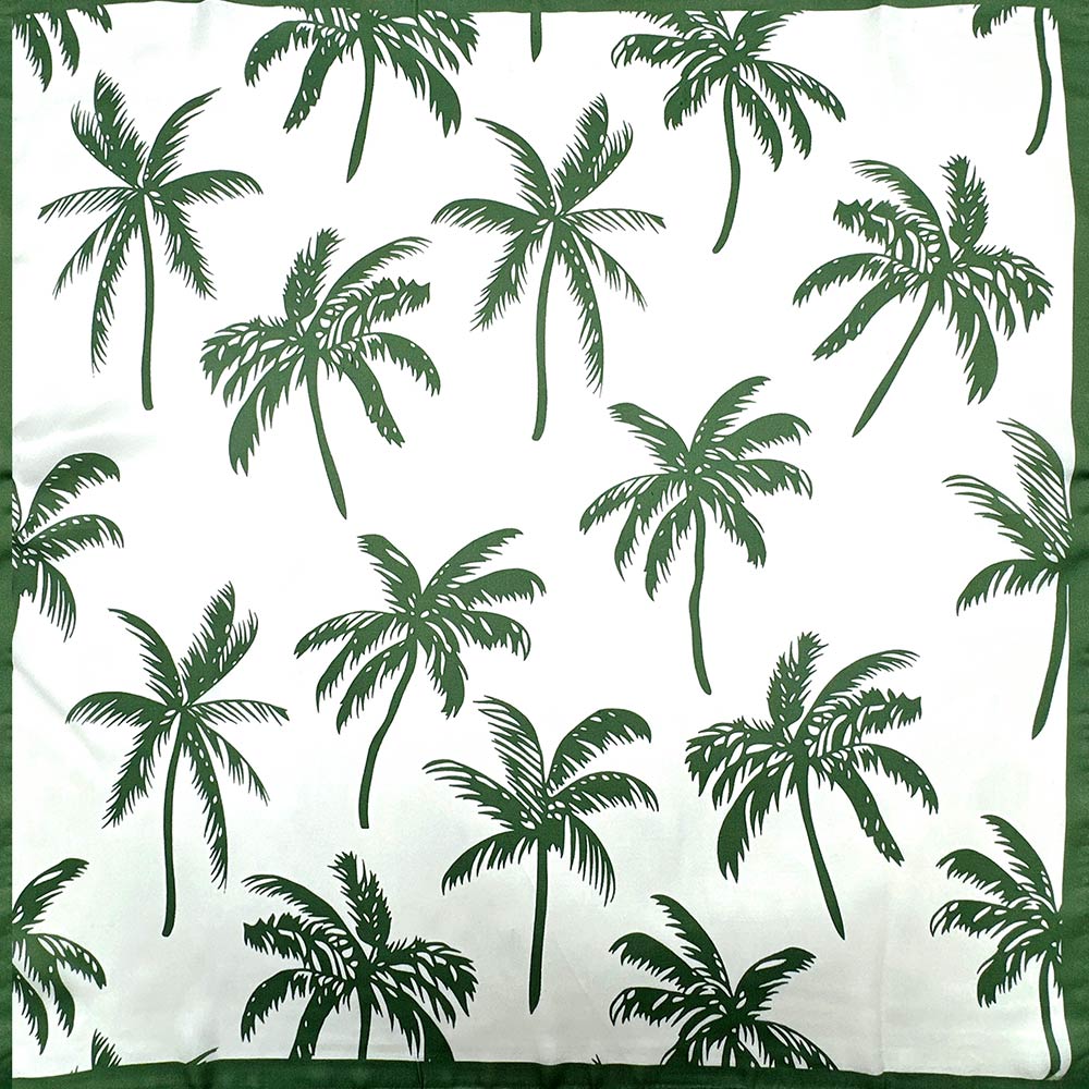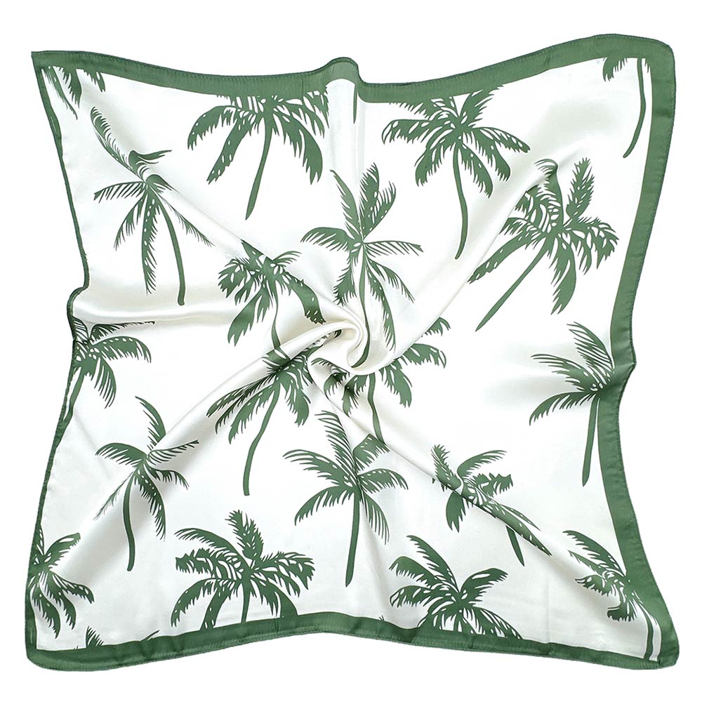 Details • Size : 27.6" X 27.6" • Material : 100% Polyester • Tropical palm tree square scarf designed in a versatile 27.6 x 27.6 inch size. Perfect for styling around the neck, hair, wrist, or bag, this scarf brings a relaxed resort-inspired feel to everyday outfits, vacations, and seasonal collections while offering effortless styling flexibility.