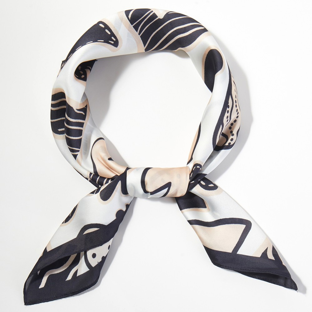 • Stylish square scarf featuring an abstract heart print with playful shapes and modern line details. Designed for versatile styling on the neck, hair, wrist, or handbag. A trendy accessory for boutiques, gift shops, seasonal collections, and everyday fashion displays.