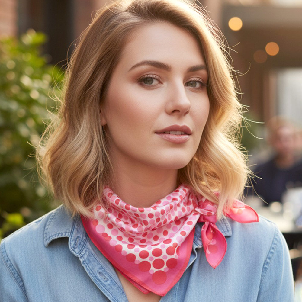 • Stylish square scarf designed with a bold polka dot pattern and clean framed layout. Easy to wear around the neck, hair, wrist, or bag for everyday styling. A versatile fashion accessory perfect for boutiques, gift shops, seasonal collections, and effortless outfit updates.