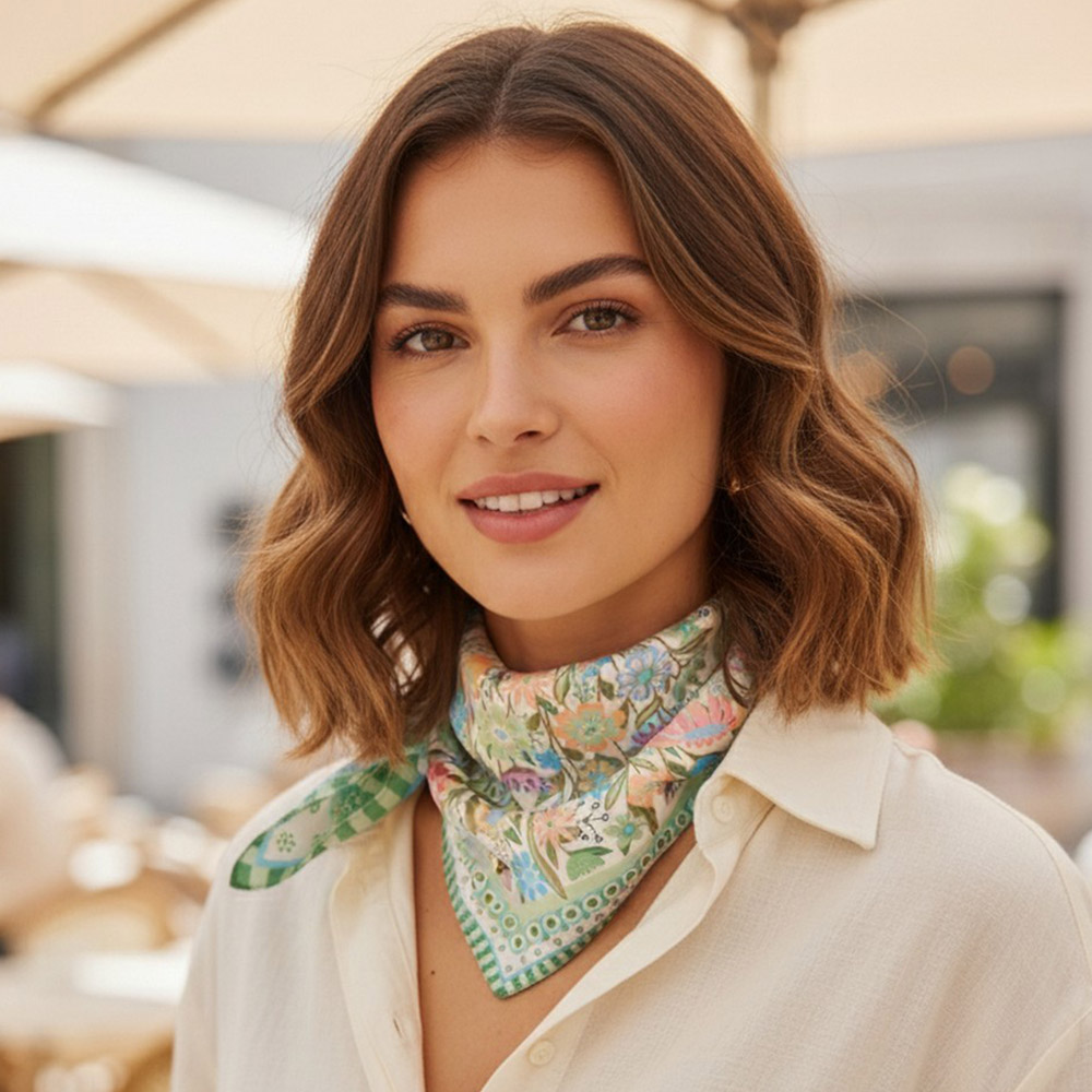 • Square fashion scarf featuring a detailed botanical meadow design with layered floral illustrations and decorative borders. Ideal for styling on the neck, hair, wrist, or handbag, this versatile accessory brings a fresh, artistic accent to everyday looks, seasonal outfits, and curated boutique collections.