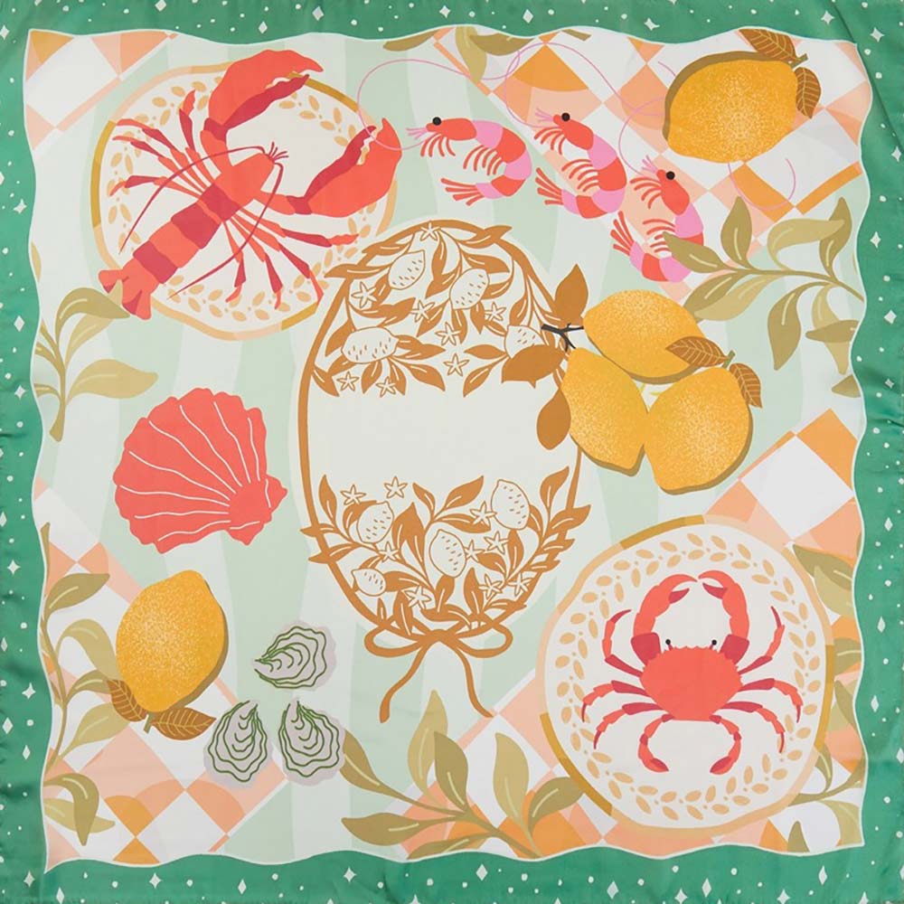• Square fashion scarf featuring a playful coastal seafood and citrus inspired illustration with decorative motifs. Designed for versatile styling as a neck scarf, hair wrap, or bag accent, offering boutiques a fresh, eye-catching accessory that works for seasonal collections, resort edits, and everyday statement looks.
